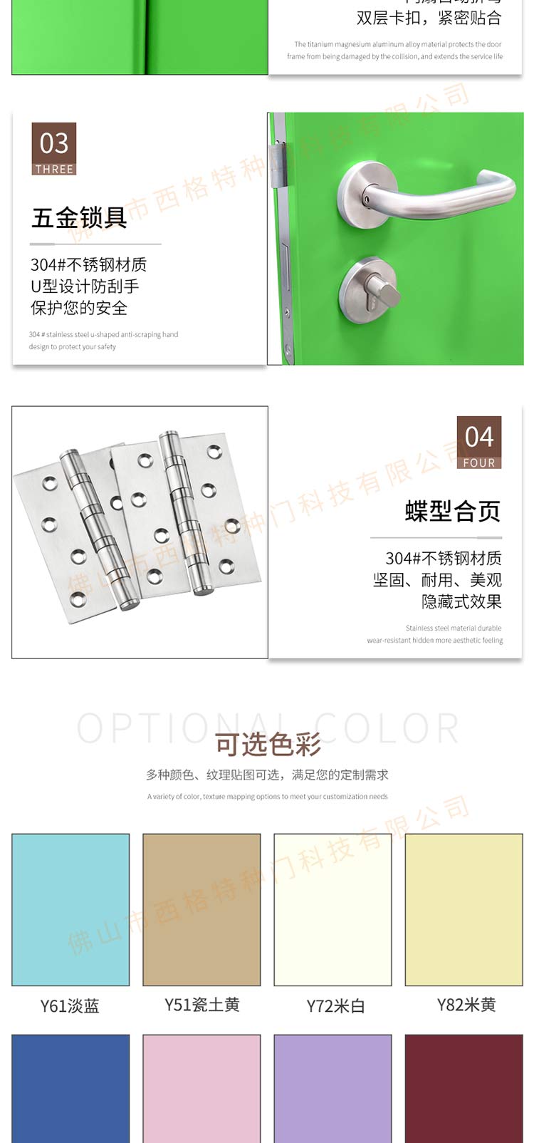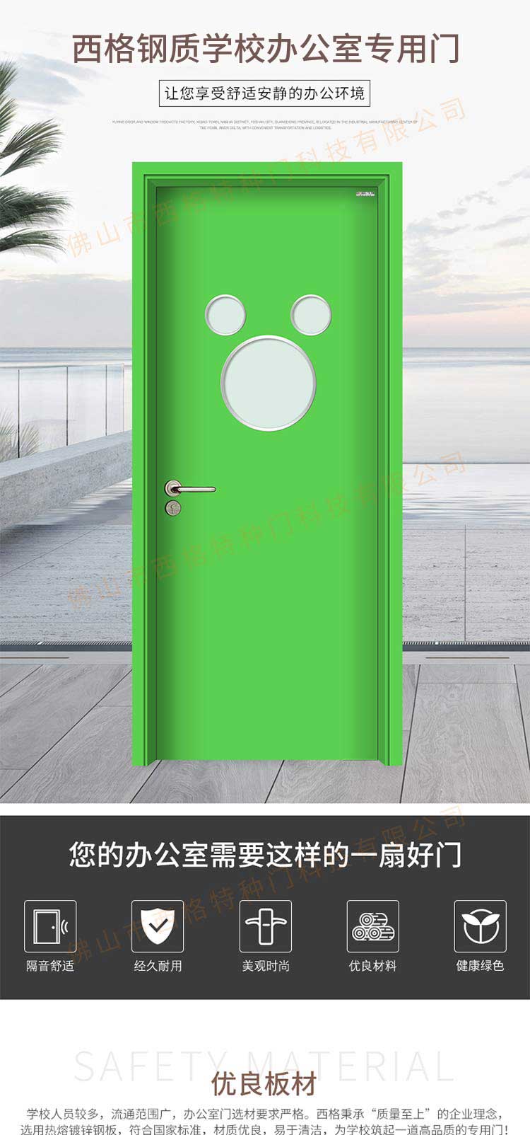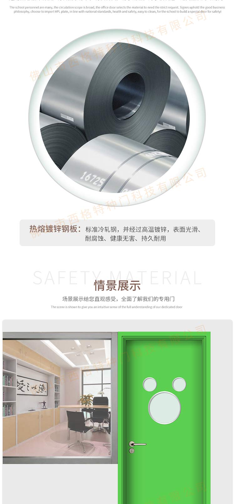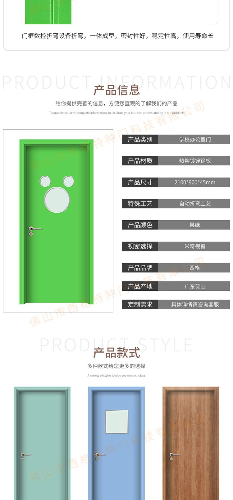 产品简介:chnsige西格特种门,专业生产学校门,学校教室门,学校办公室门,学校钢质门,钢质学校门,多钟款式、颜色,尺寸可定制。