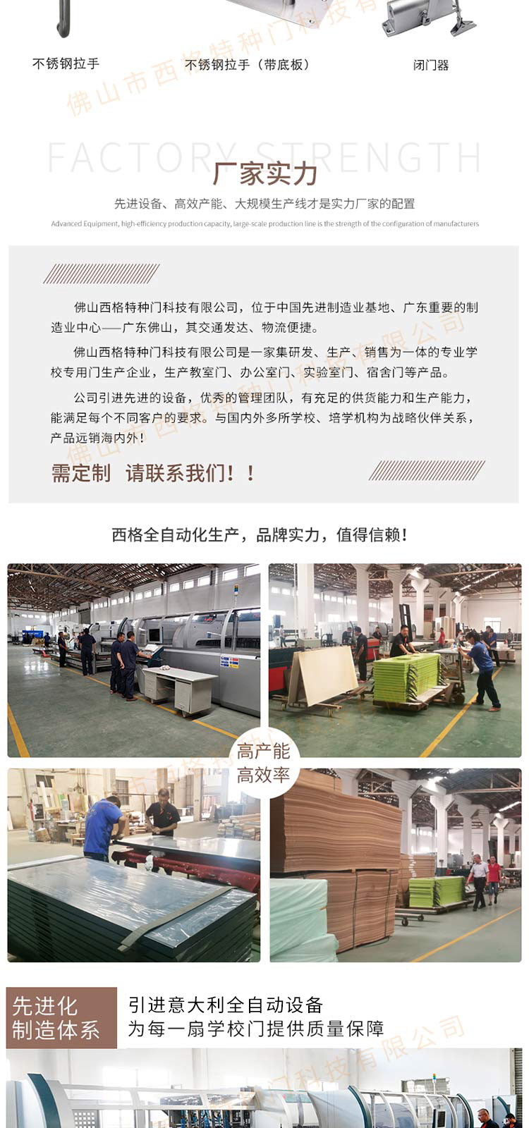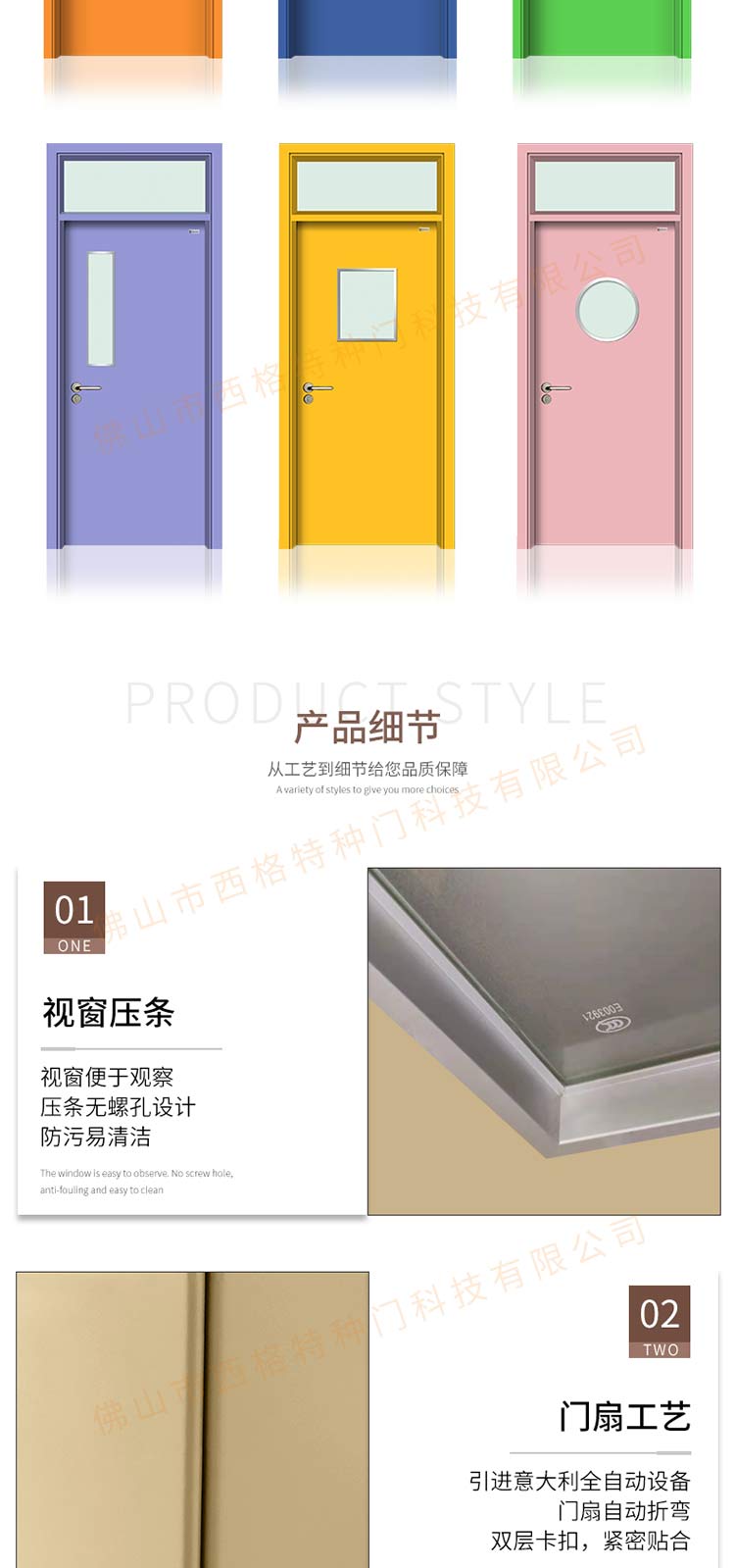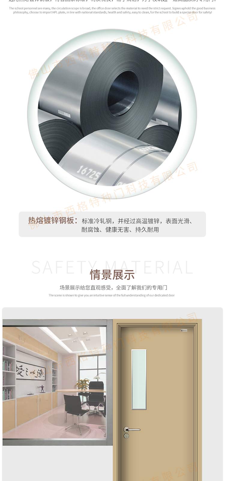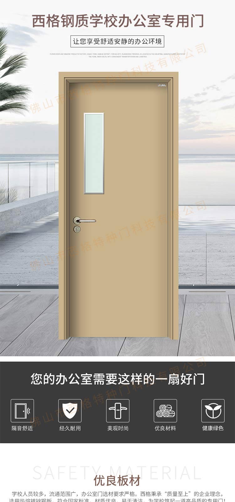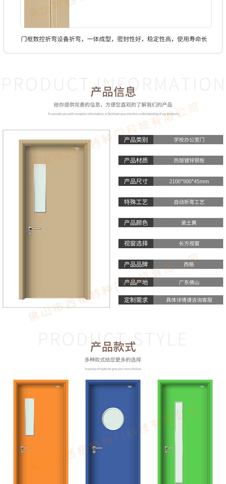 产品简介:chnsige西格特种门,专业生产学校门,学校教室门,学校办公室门,学校钢质门,钢质学校门,多钟款式、颜色,尺寸可定制。
