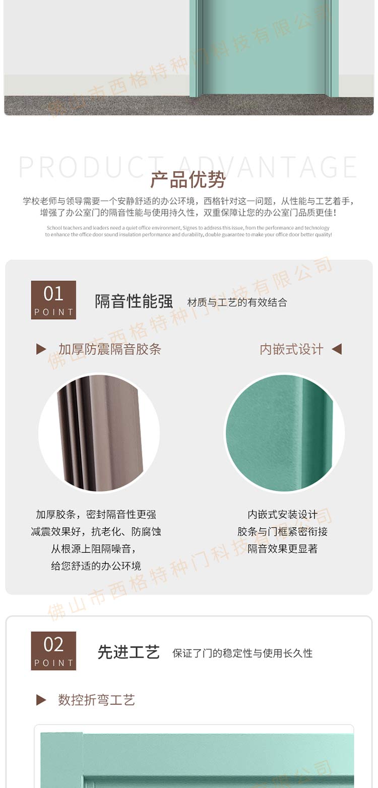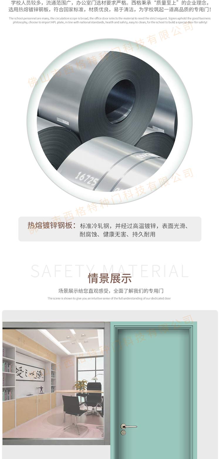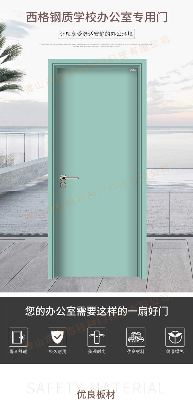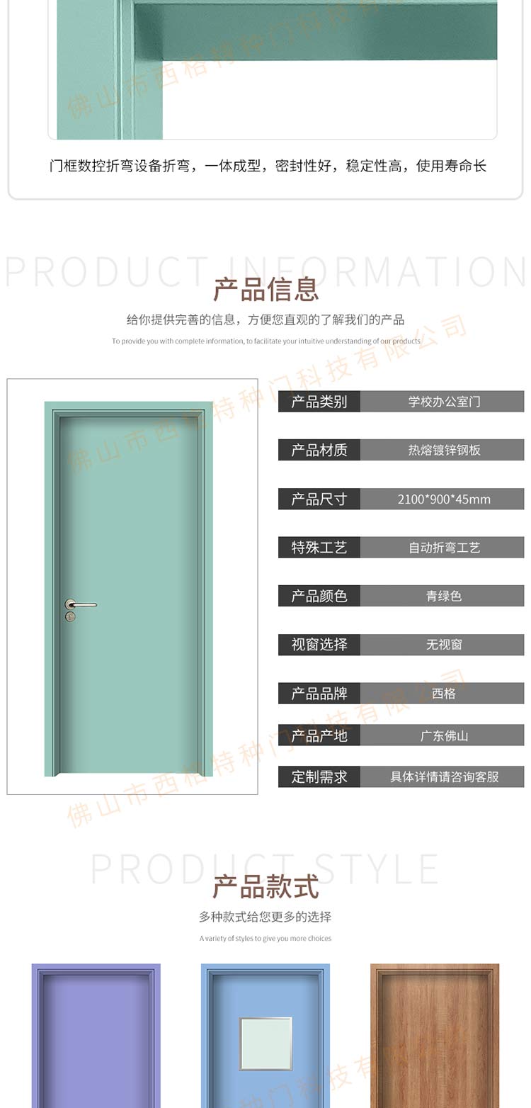 产品简介:chnsige西格特种门,专业生产学校门,学校教室门,学校办公室门,学校钢质门,钢质学校门,多钟款式、颜色,尺寸可定制。