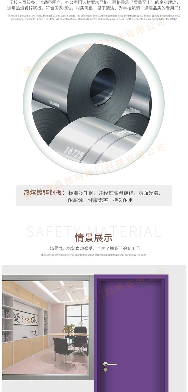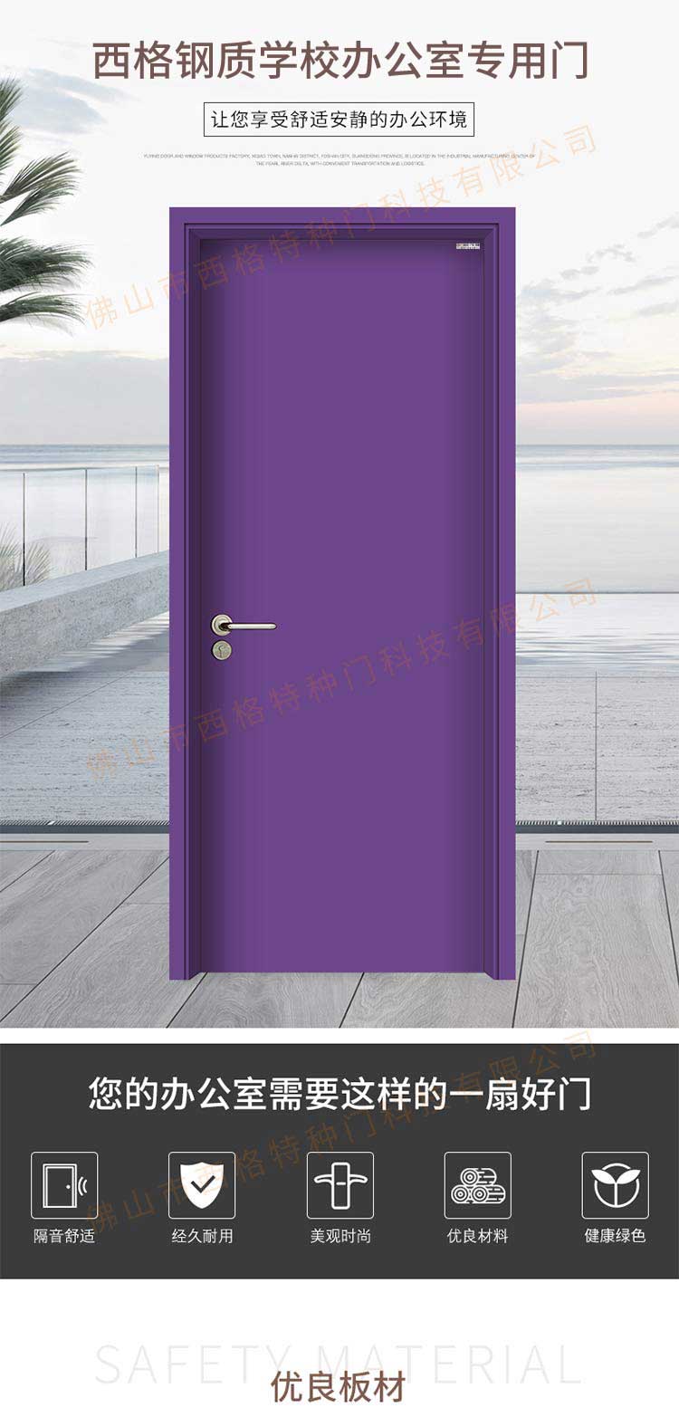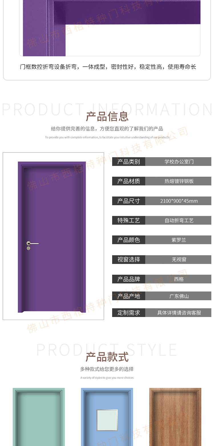 产品简介:chnsige西格特种门,专业生产学校门,学校教室门,学校办公室门,学校钢质门,钢质学校门,多钟款式、颜色,尺寸可定制。