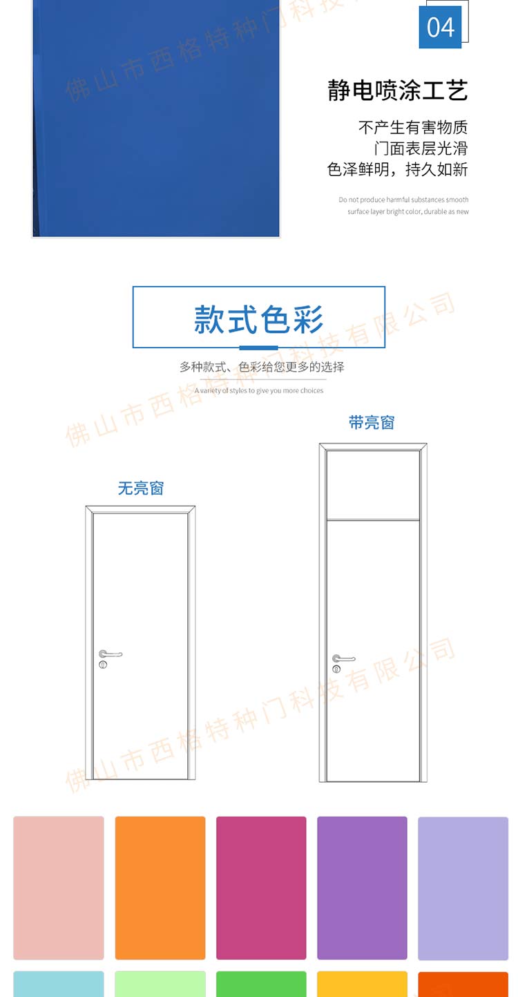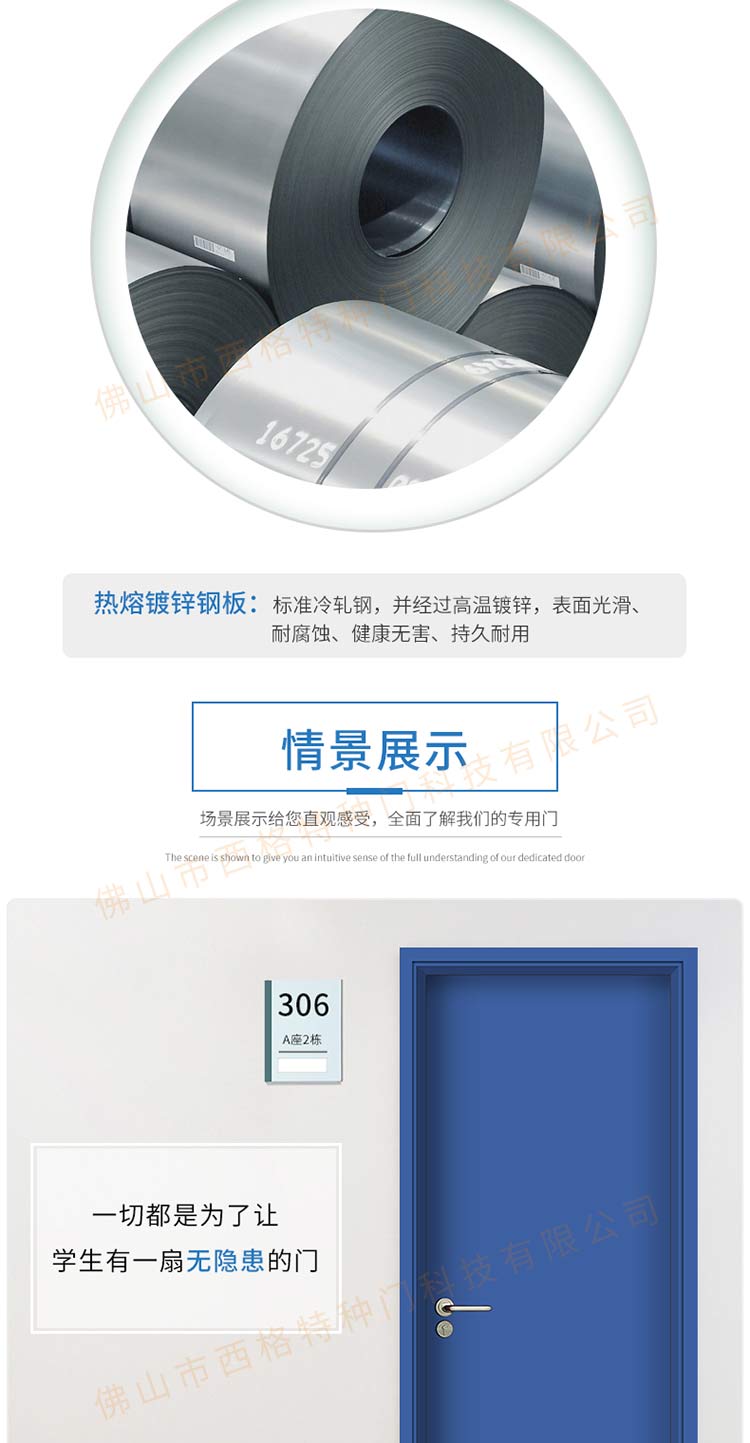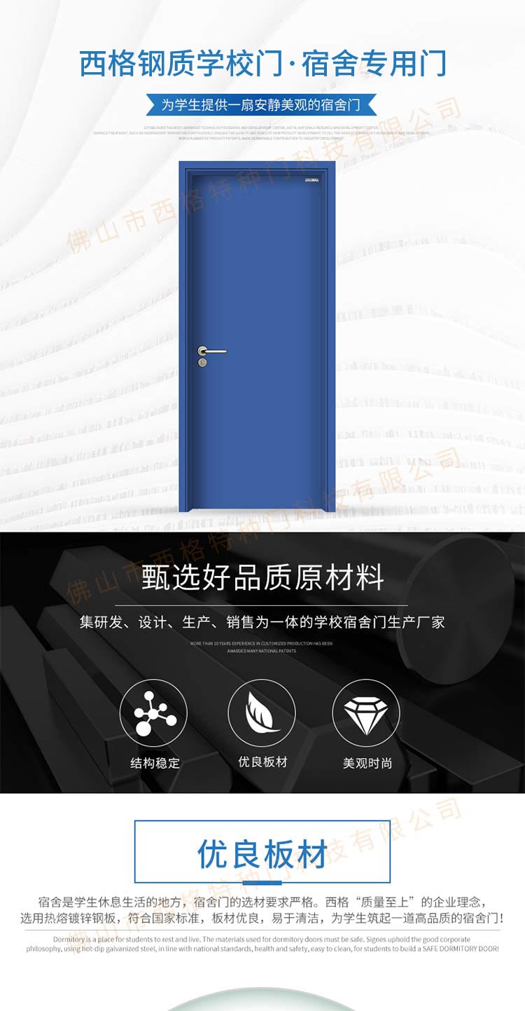 产品简介:chnsige西格特种门,专业生产学校门,学校宿舍门,学校公寓门,学校宿舍门,钢质宿舍门,多钟款式、颜色,尺寸可定制。