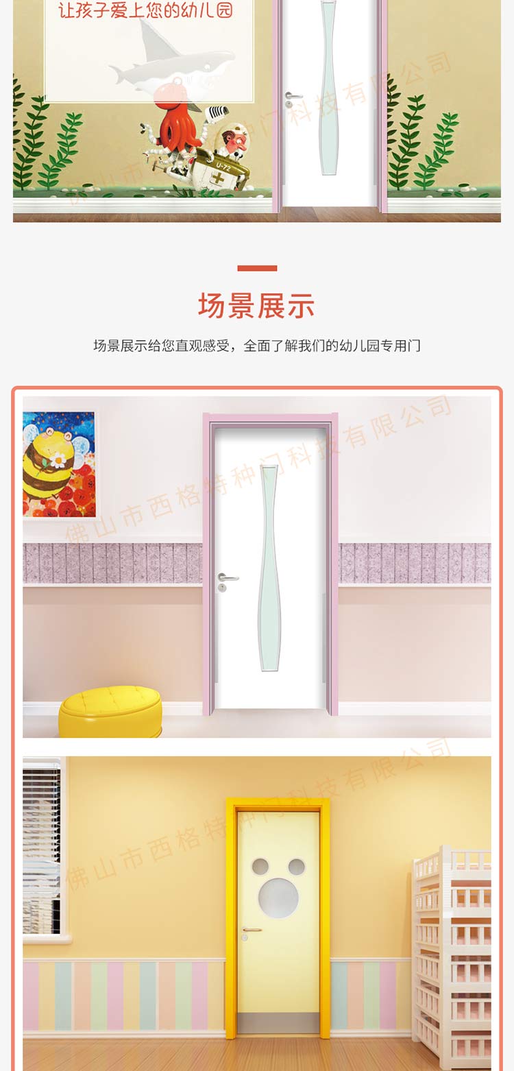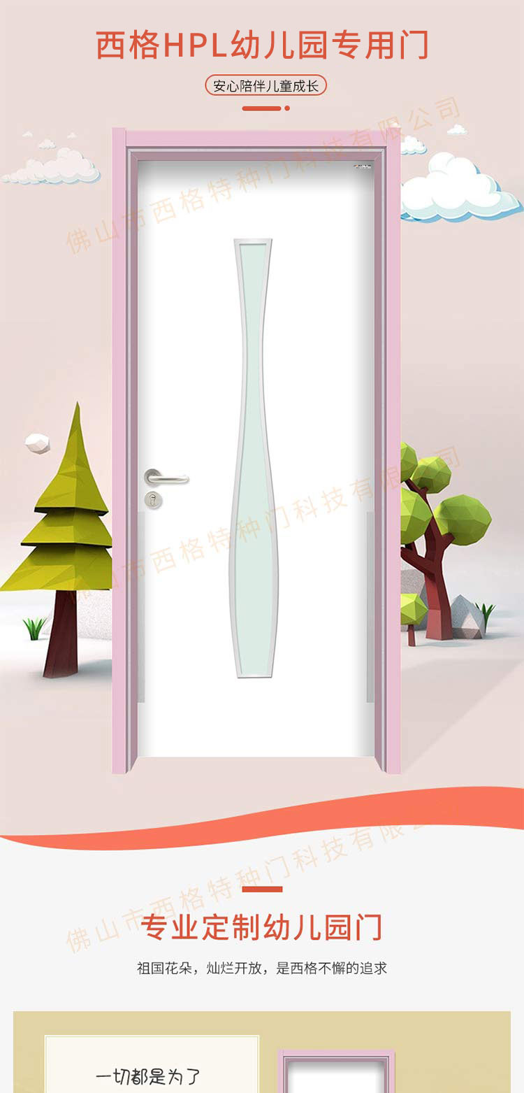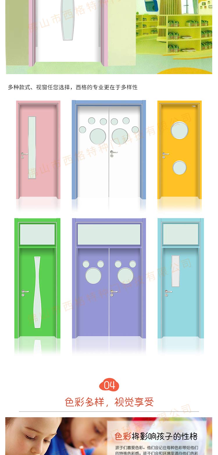 产品简介:chnsige西格特种门,专业生产幼儿园门,防夹手幼儿园门,多钟款式、颜色,尺寸可定制。