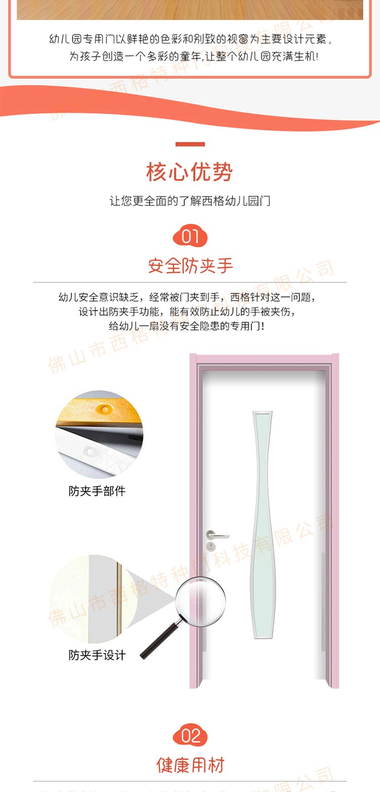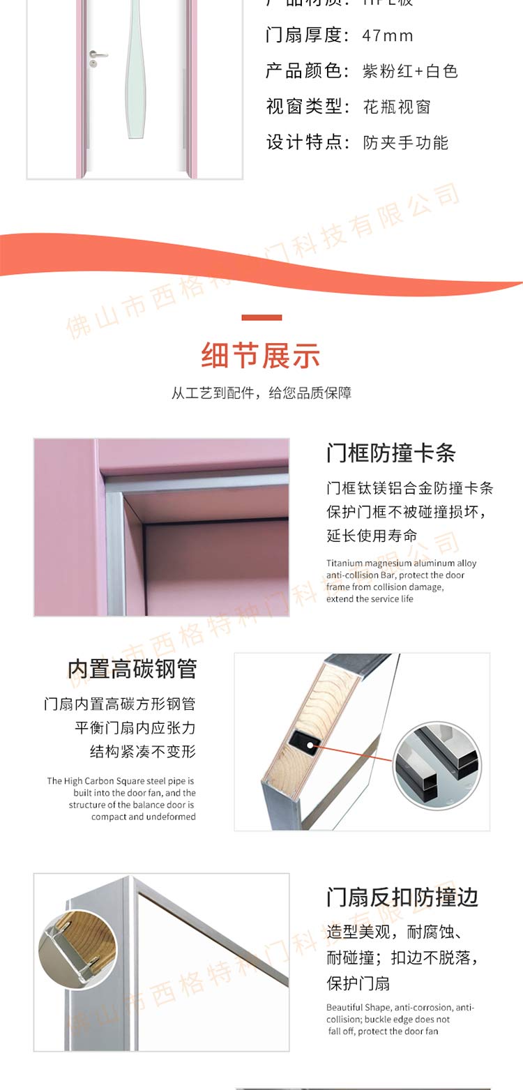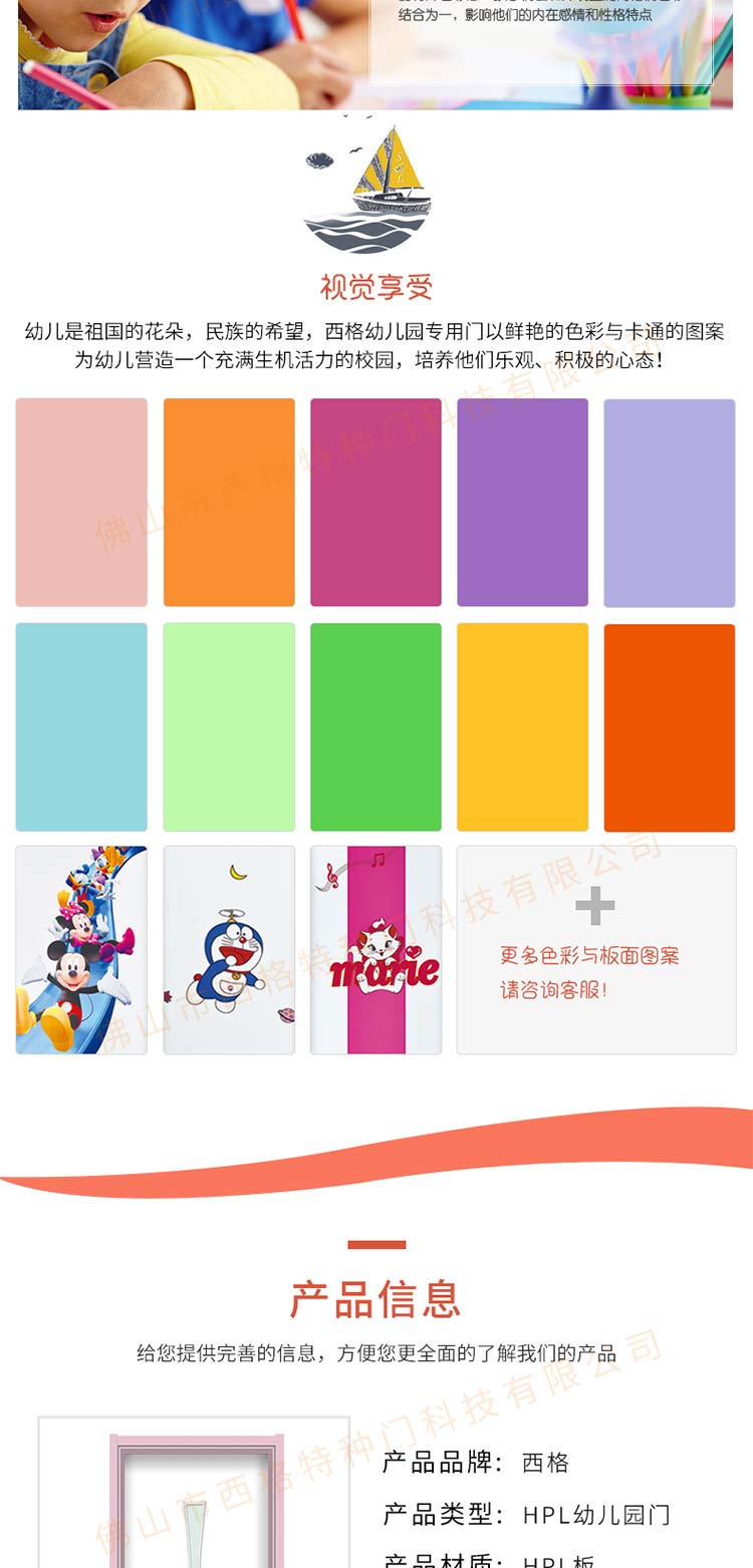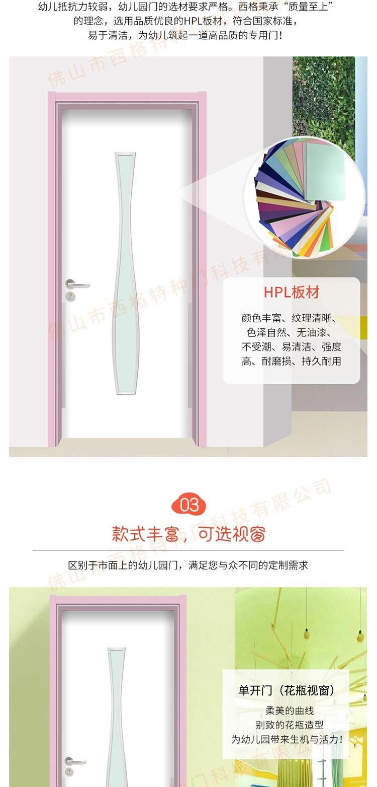 产品简介:chnsige西格特种门,专业生产幼儿园门,防夹手幼儿园门,多钟款式、颜色,尺寸可定制。