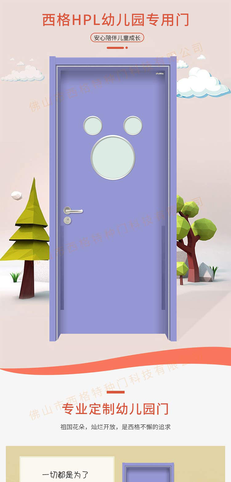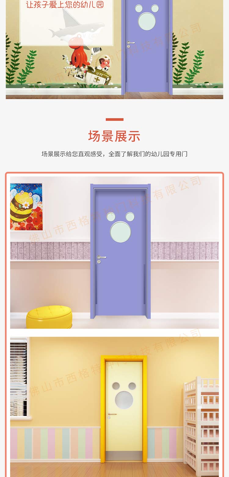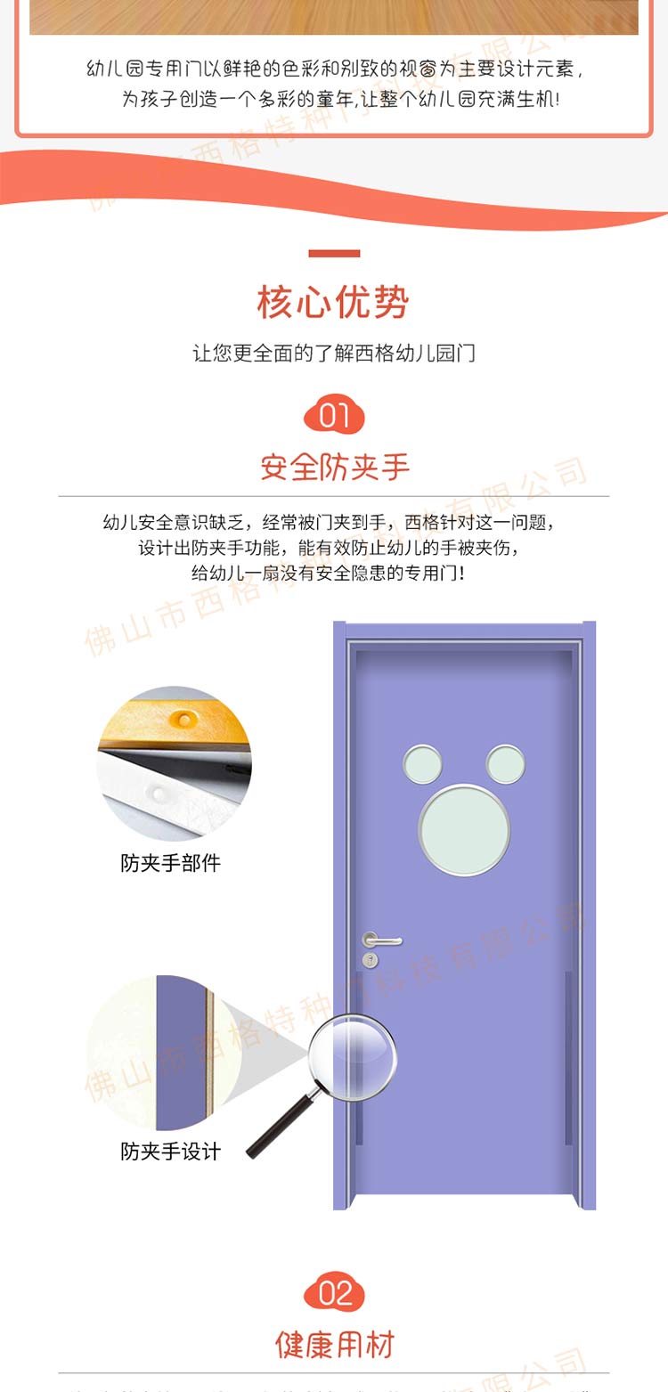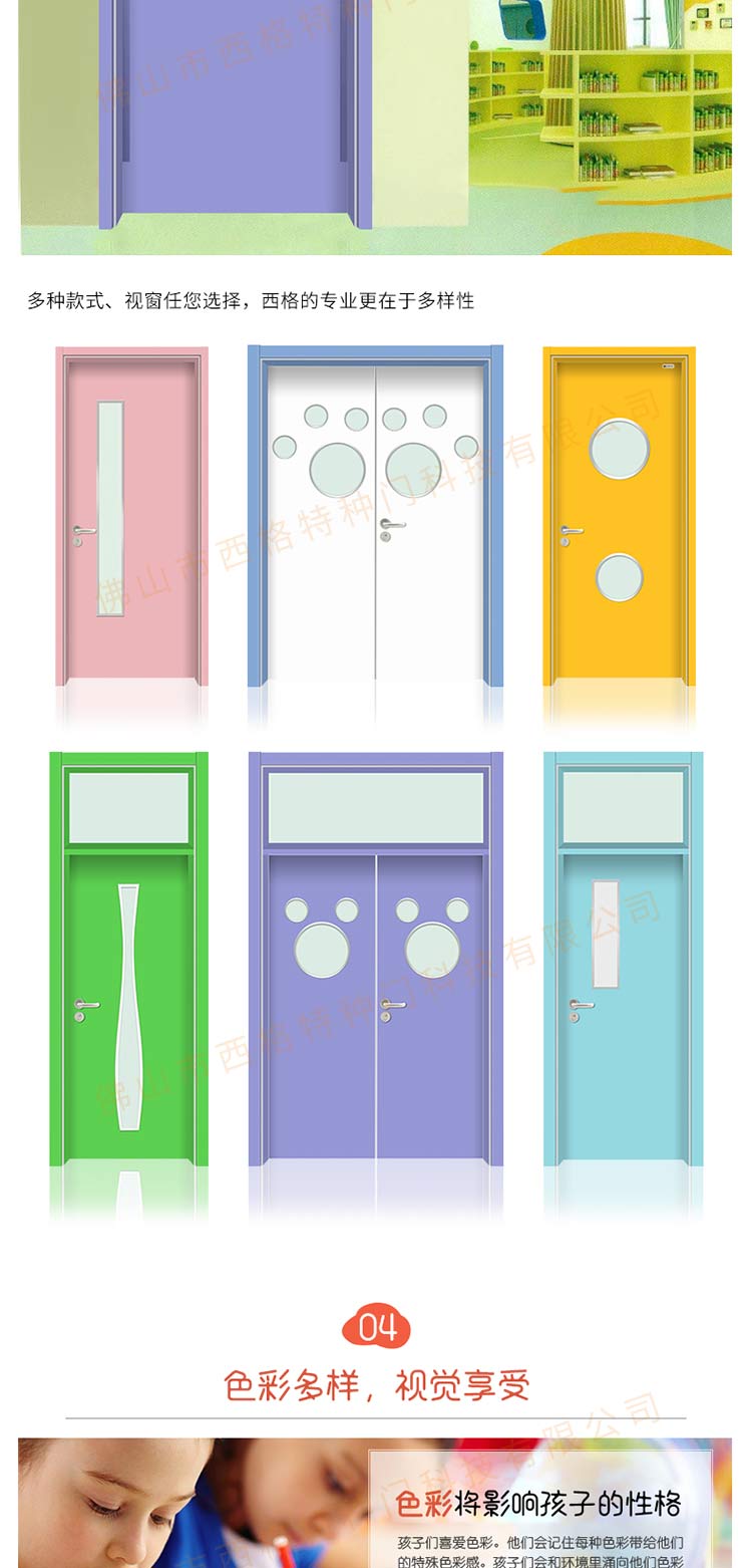 产品简介:chnsige西格特种门,专业生产幼儿园门,防夹手幼儿园门,多钟款式、颜色,尺寸可定制。