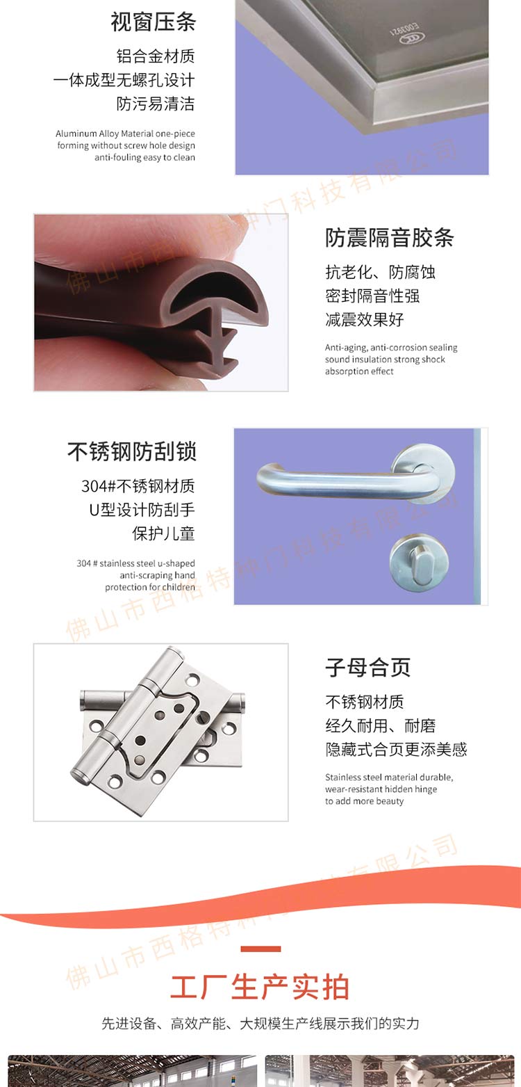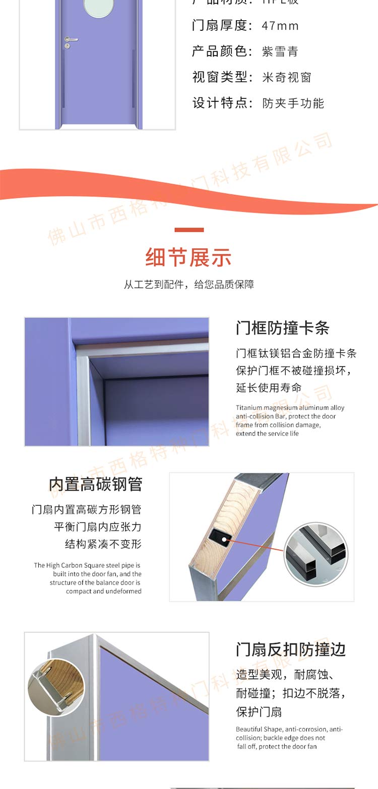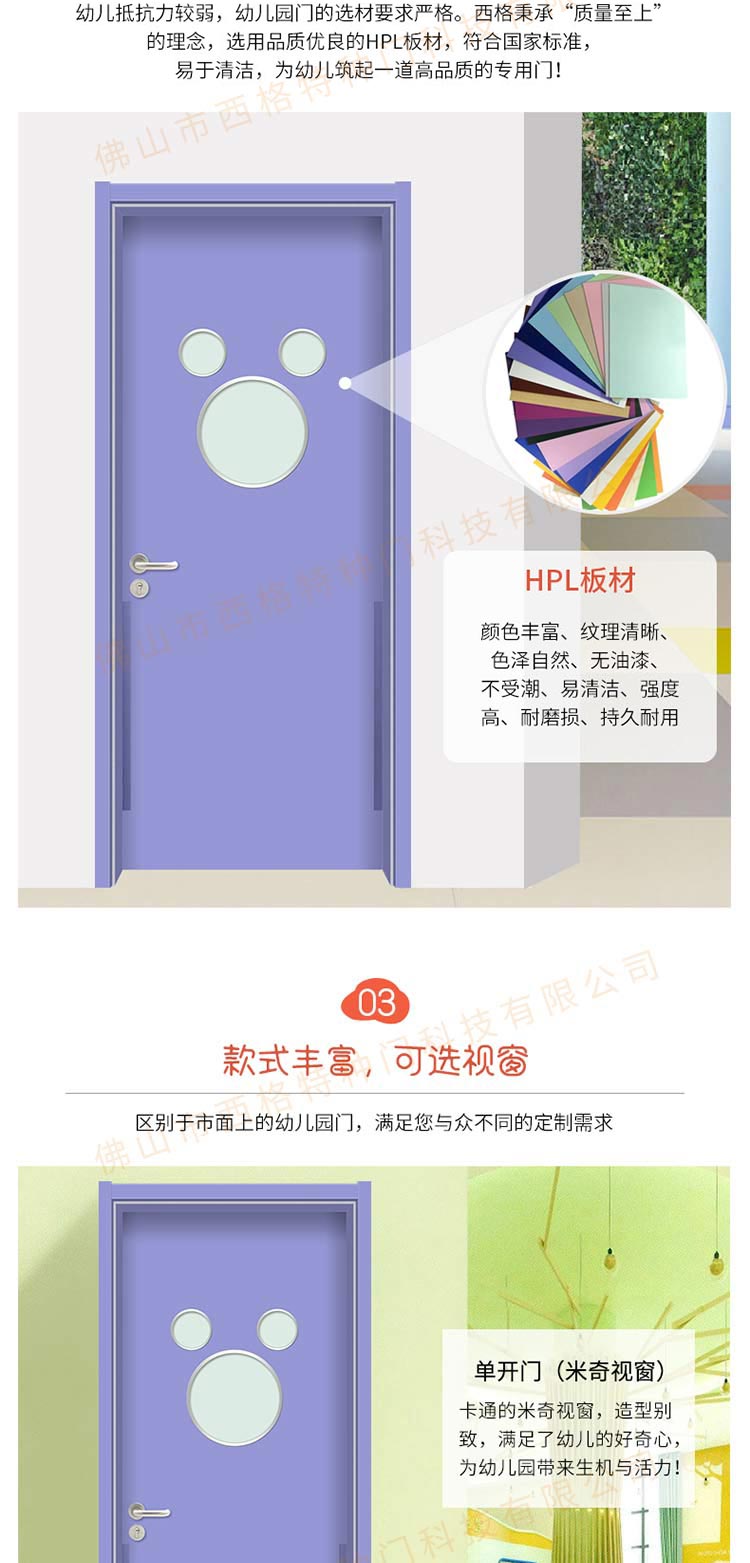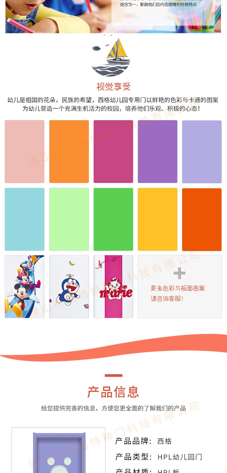 产品简介:chnsige西格特种门,专业生产幼儿园门,防夹手幼儿园门,多钟款式、颜色,尺寸可定制。