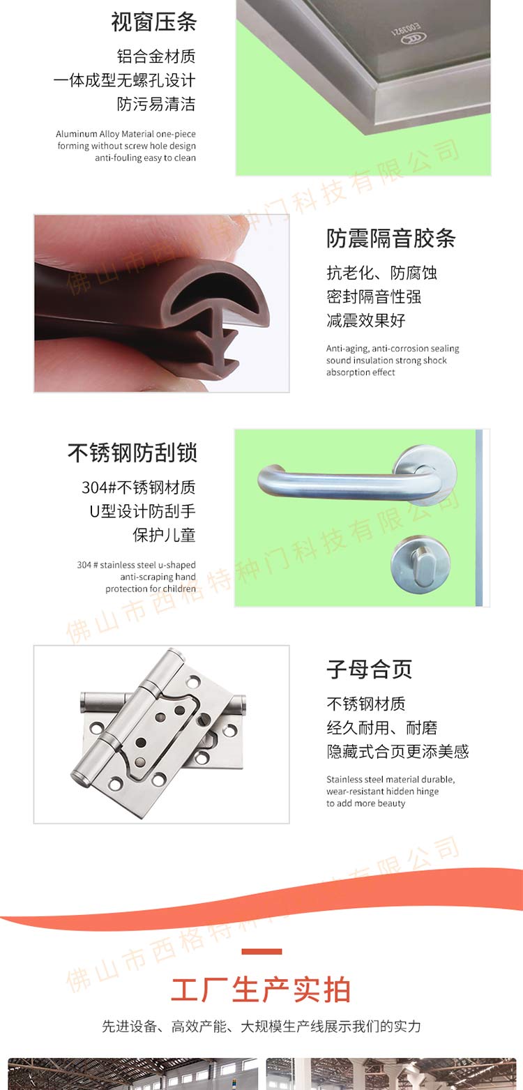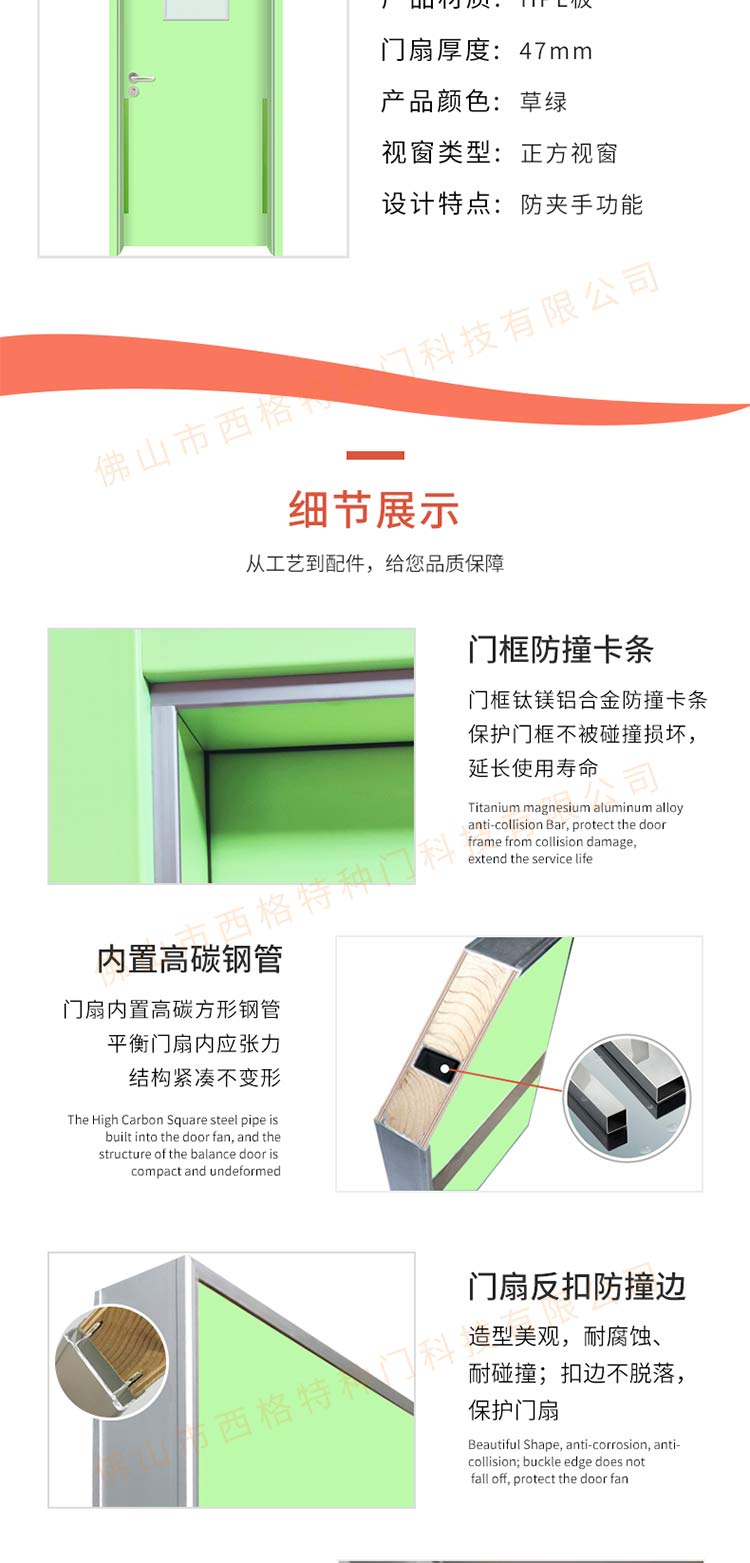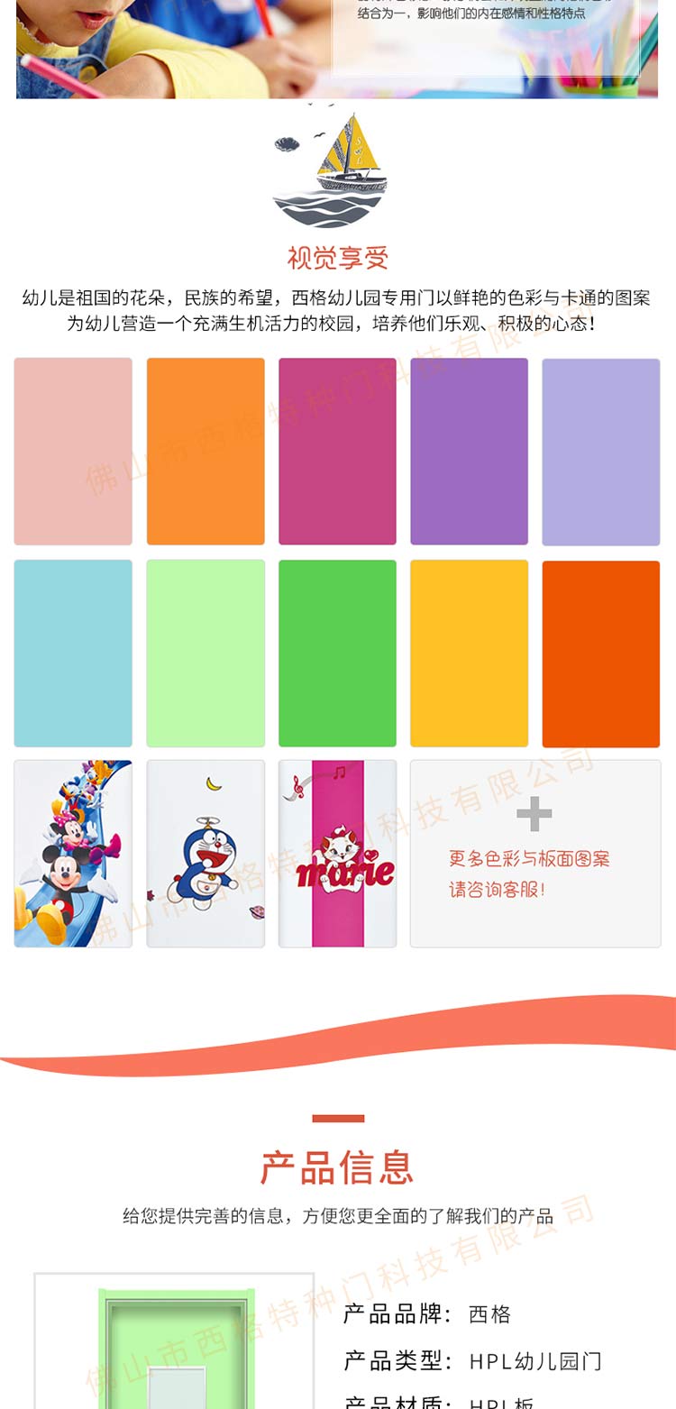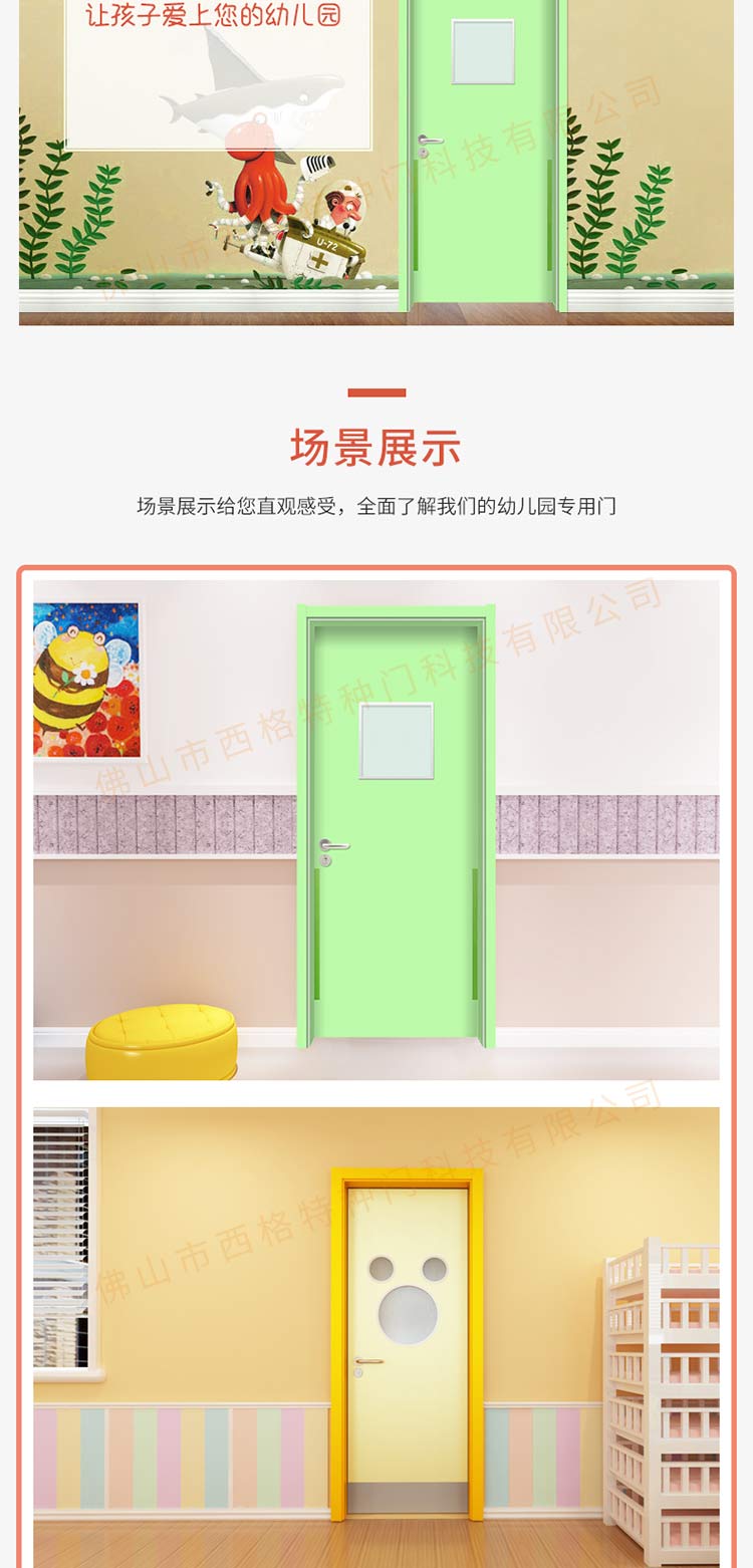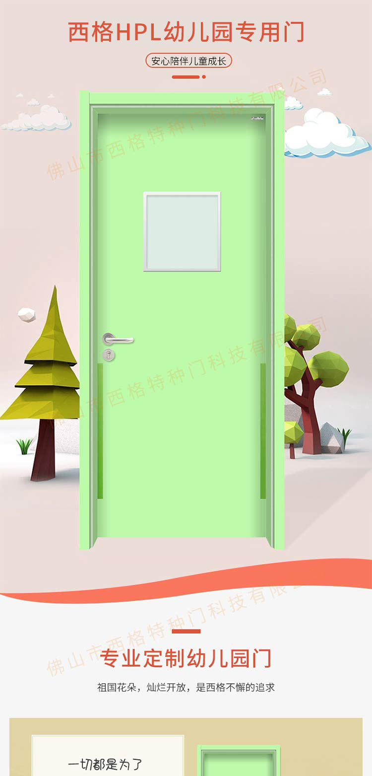 产品简介:chnsige西格特种门,专业生产幼儿园门,防夹手幼儿园门,多钟款式、颜色,尺寸可定制。