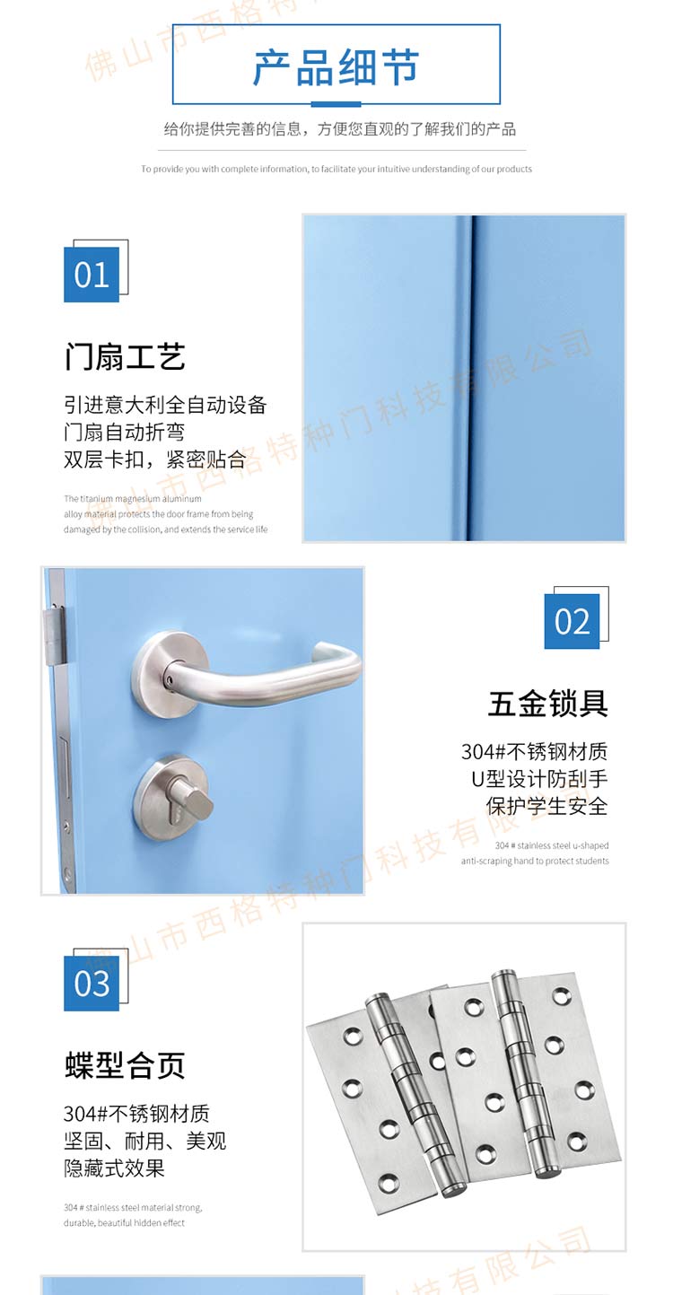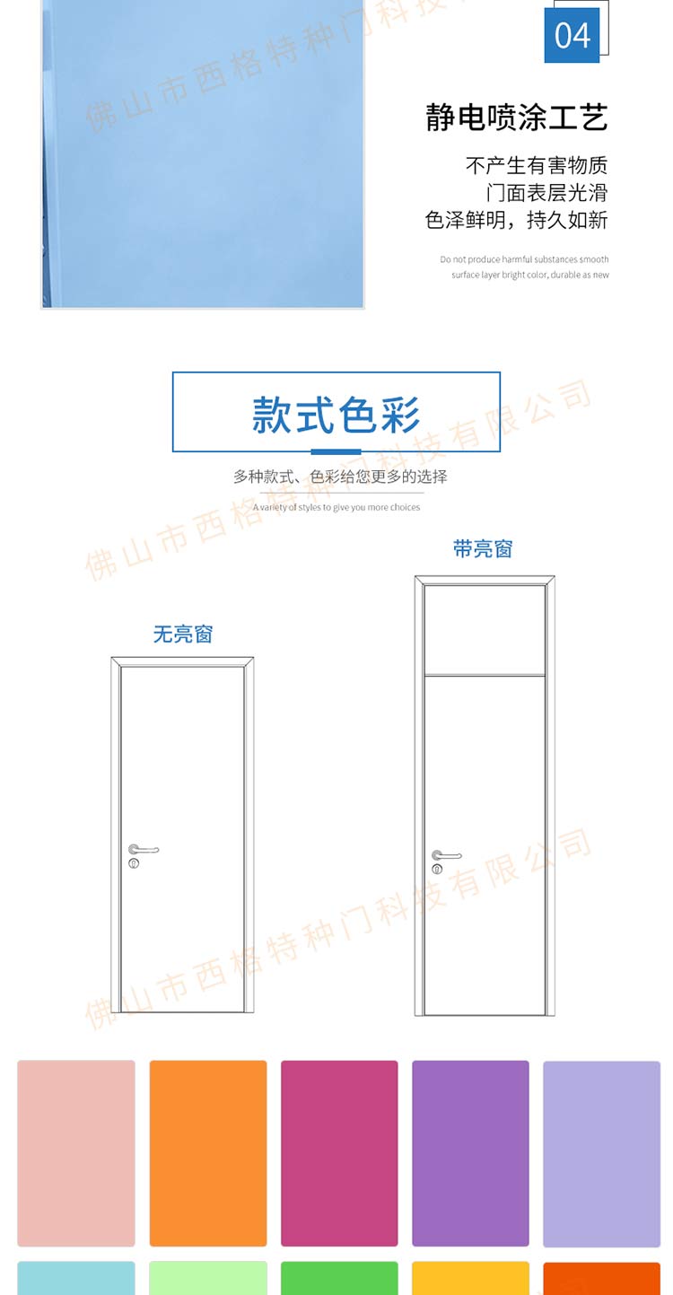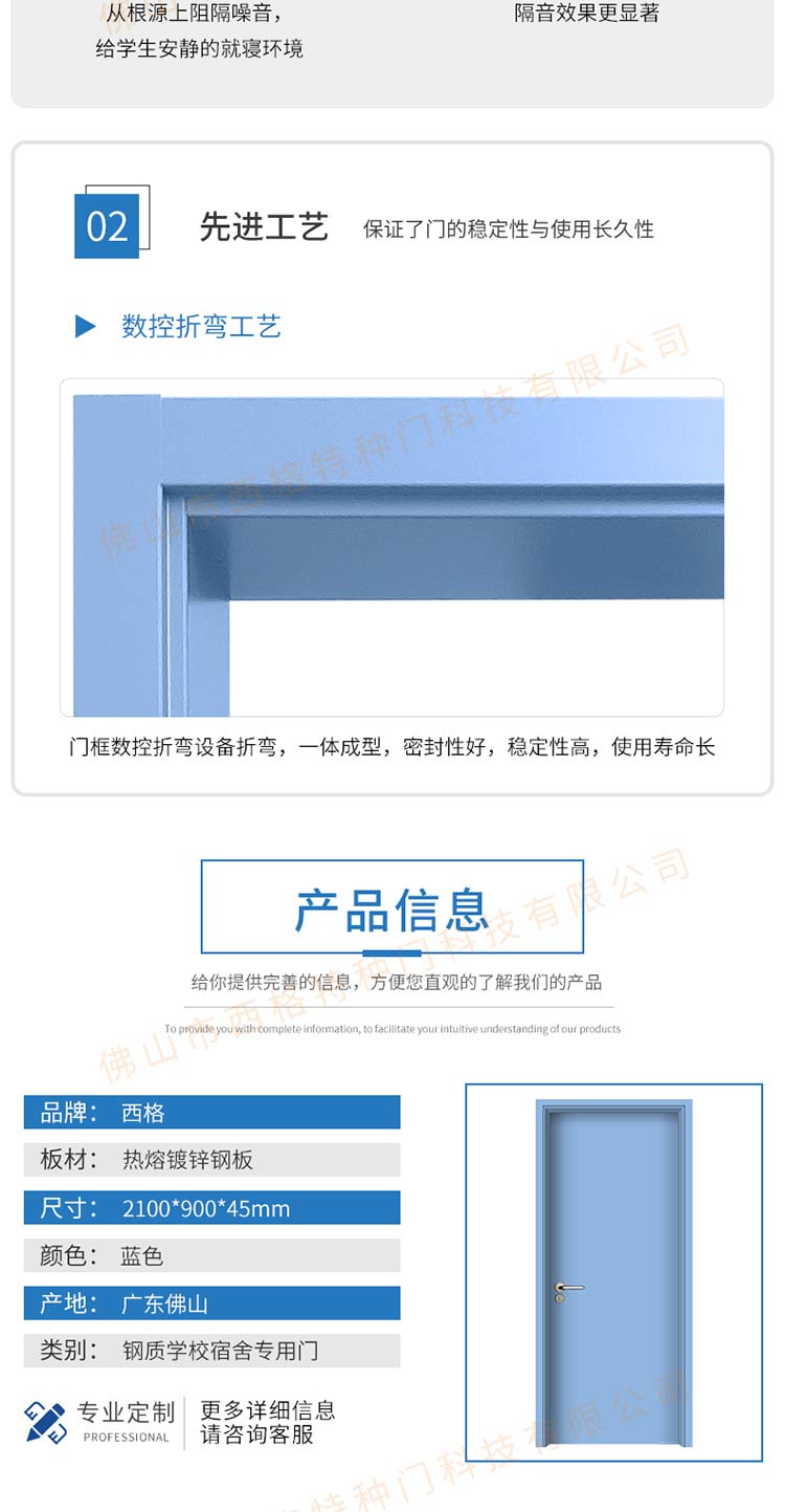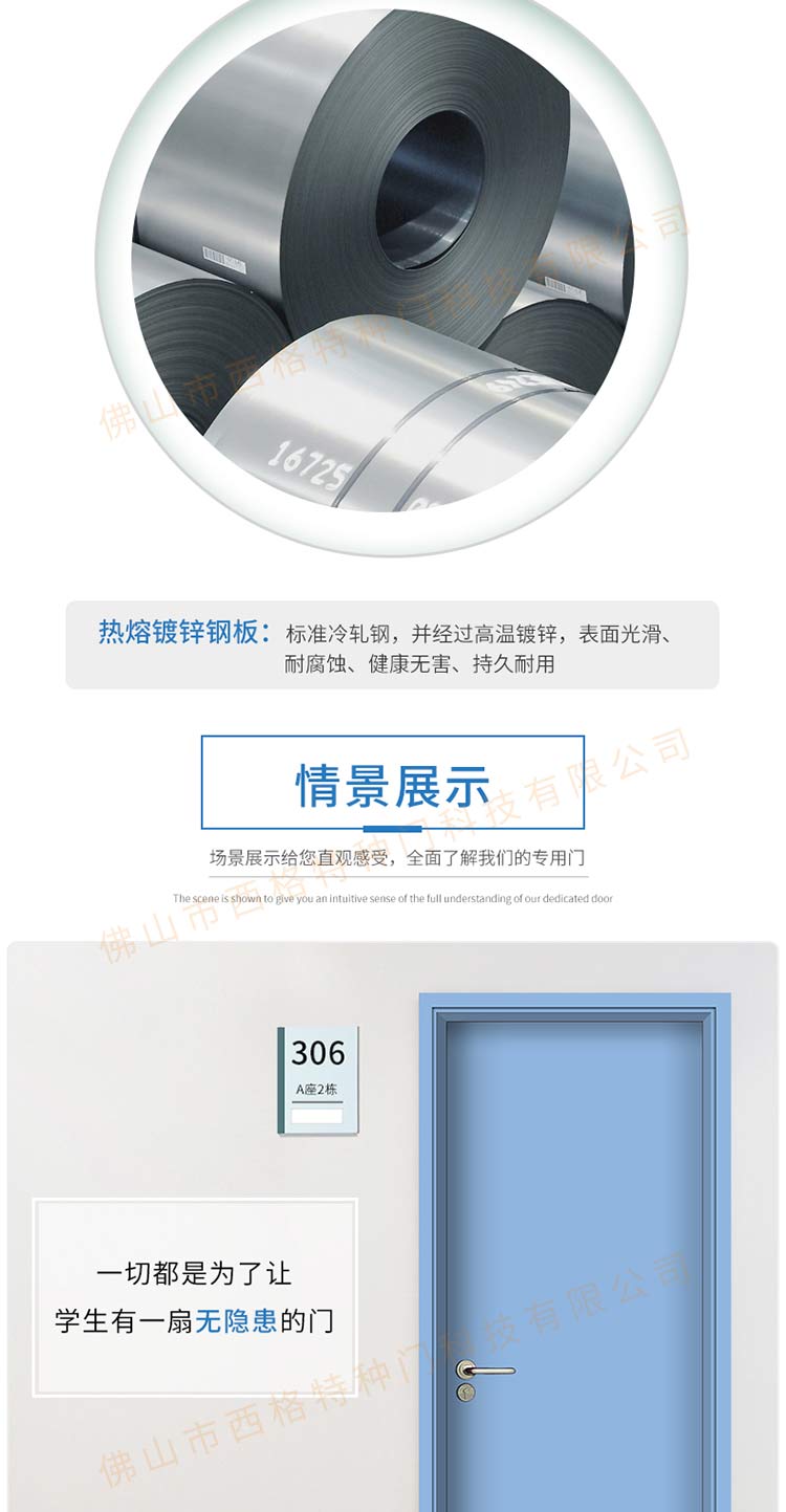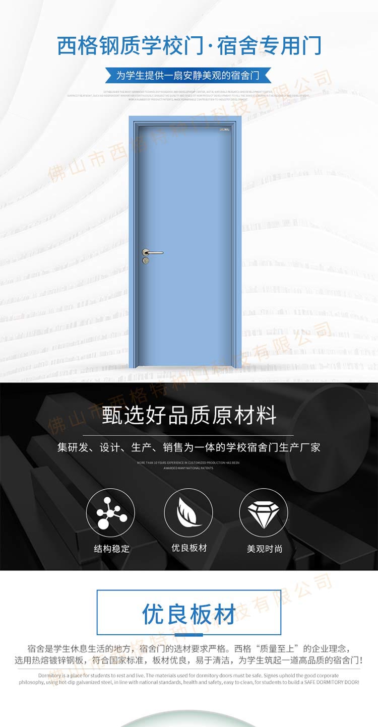 产品简介:chnsige西格特种门,专业生产学校门,学校宿舍门,学校公寓门,学校宿舍门,钢质宿舍门,多钟款式、颜色,尺寸可定制。