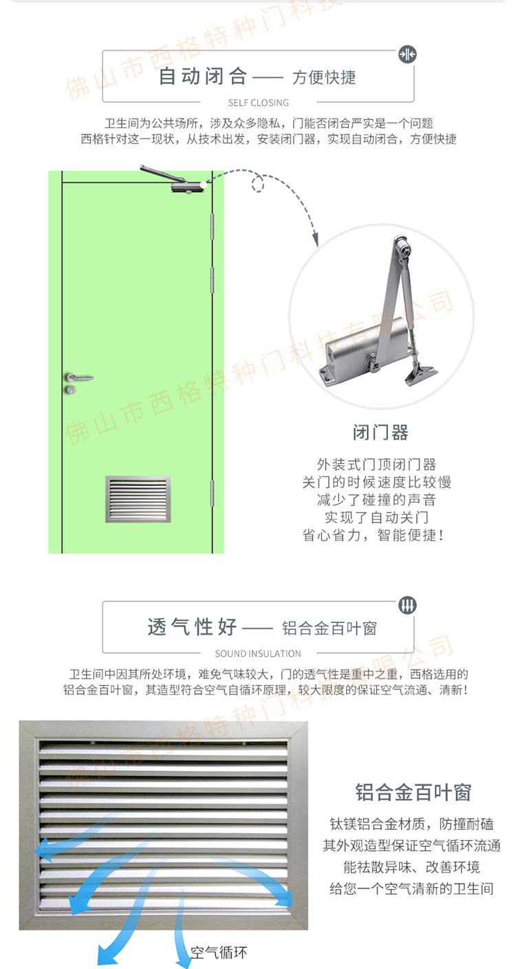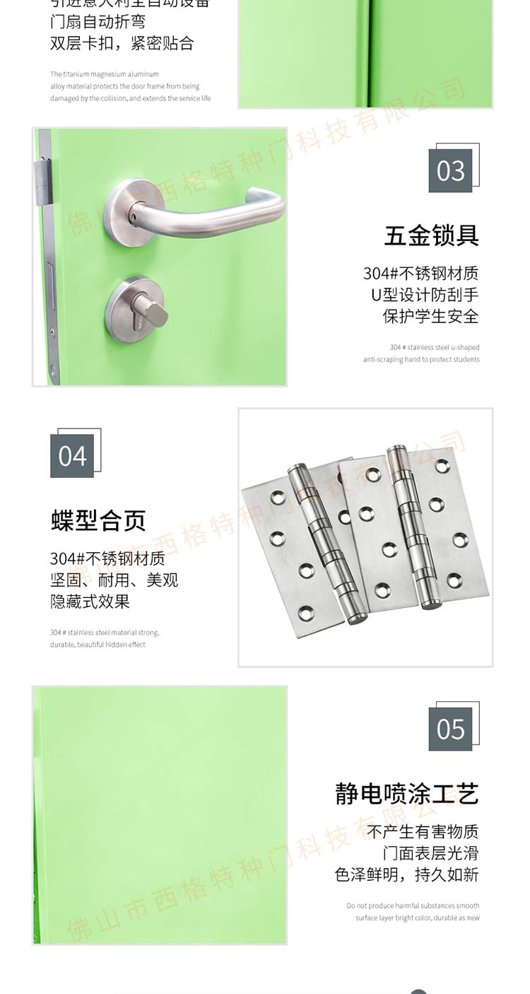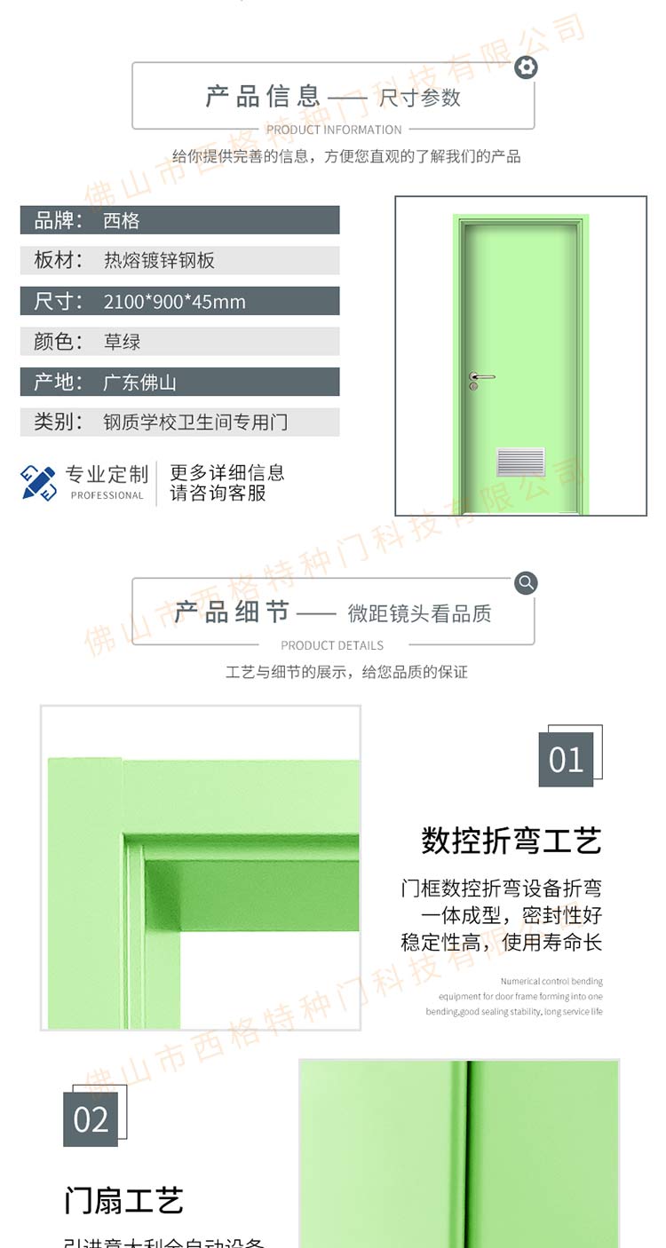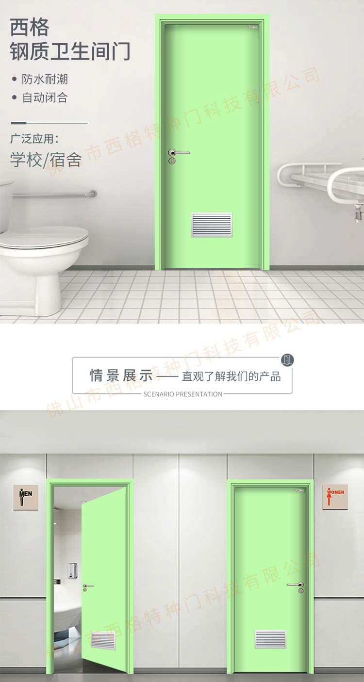 产品简介:chnsige西格特种门,专业生产学校门,学校卫生间门,学校洗手间门,钢质洗手间门,多钟款式、颜色,尺寸可定制。