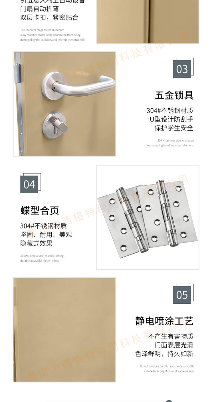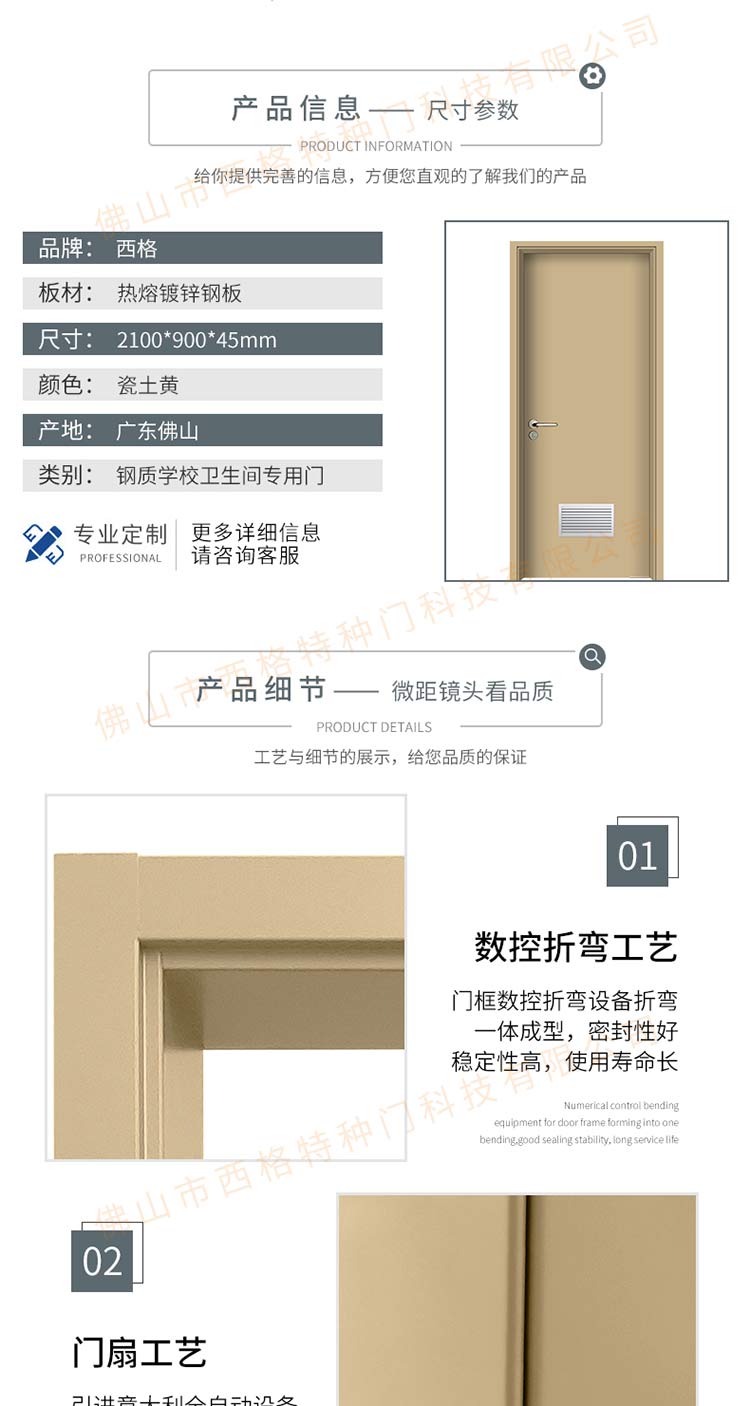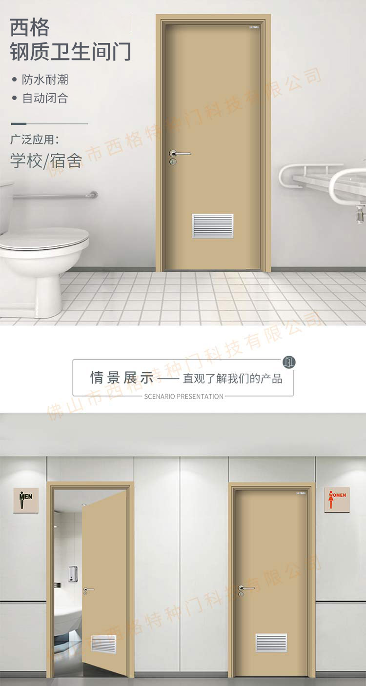 产品简介:chnsige西格特种门,专业生产学校门,学校卫生间门,学校洗手间门,钢质洗手间门,多钟款式、颜色,尺寸可定制。