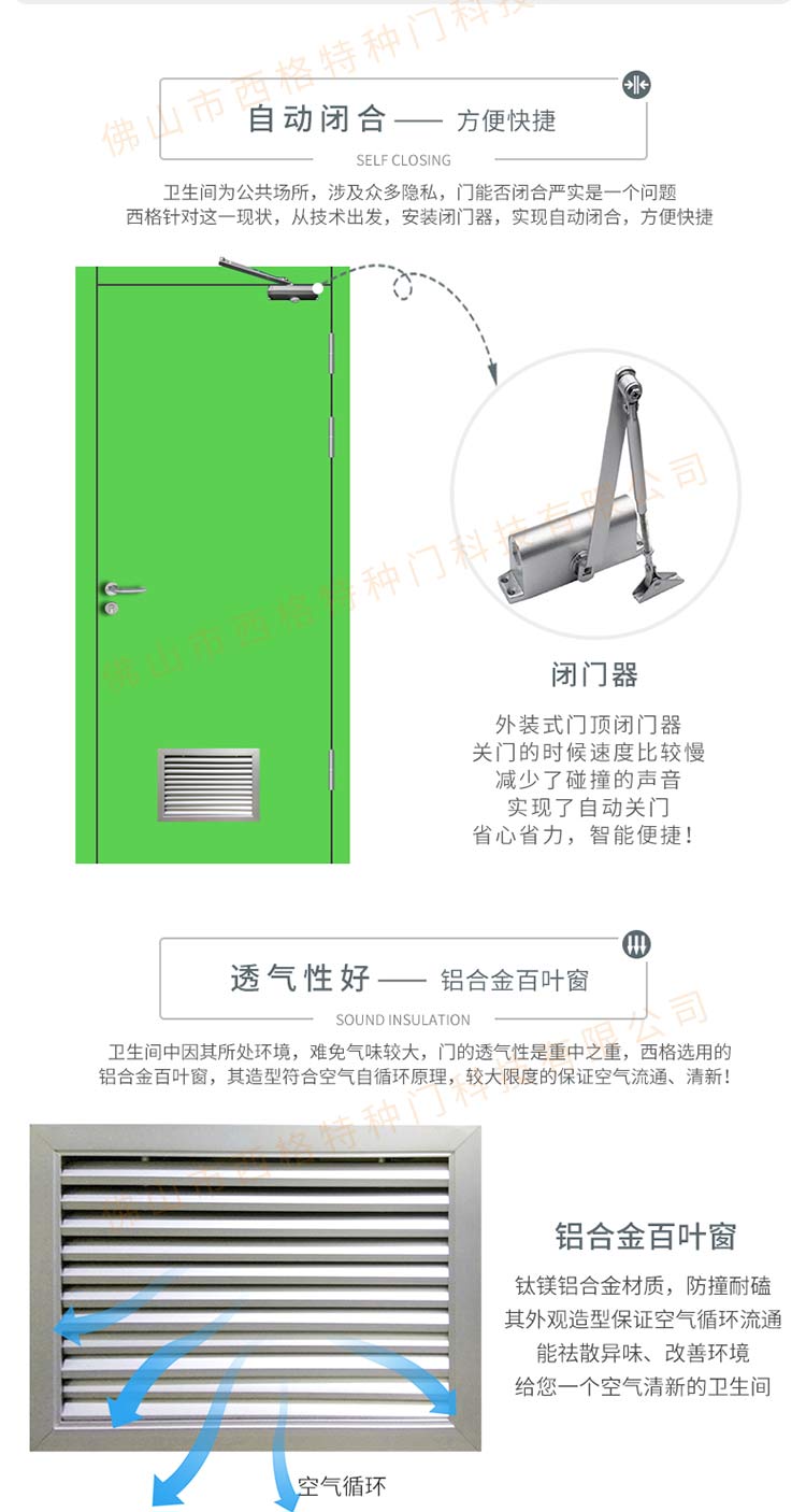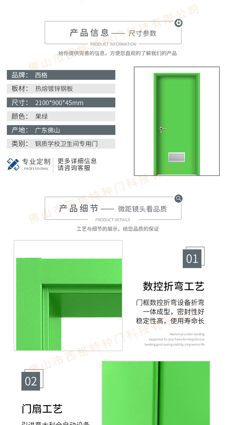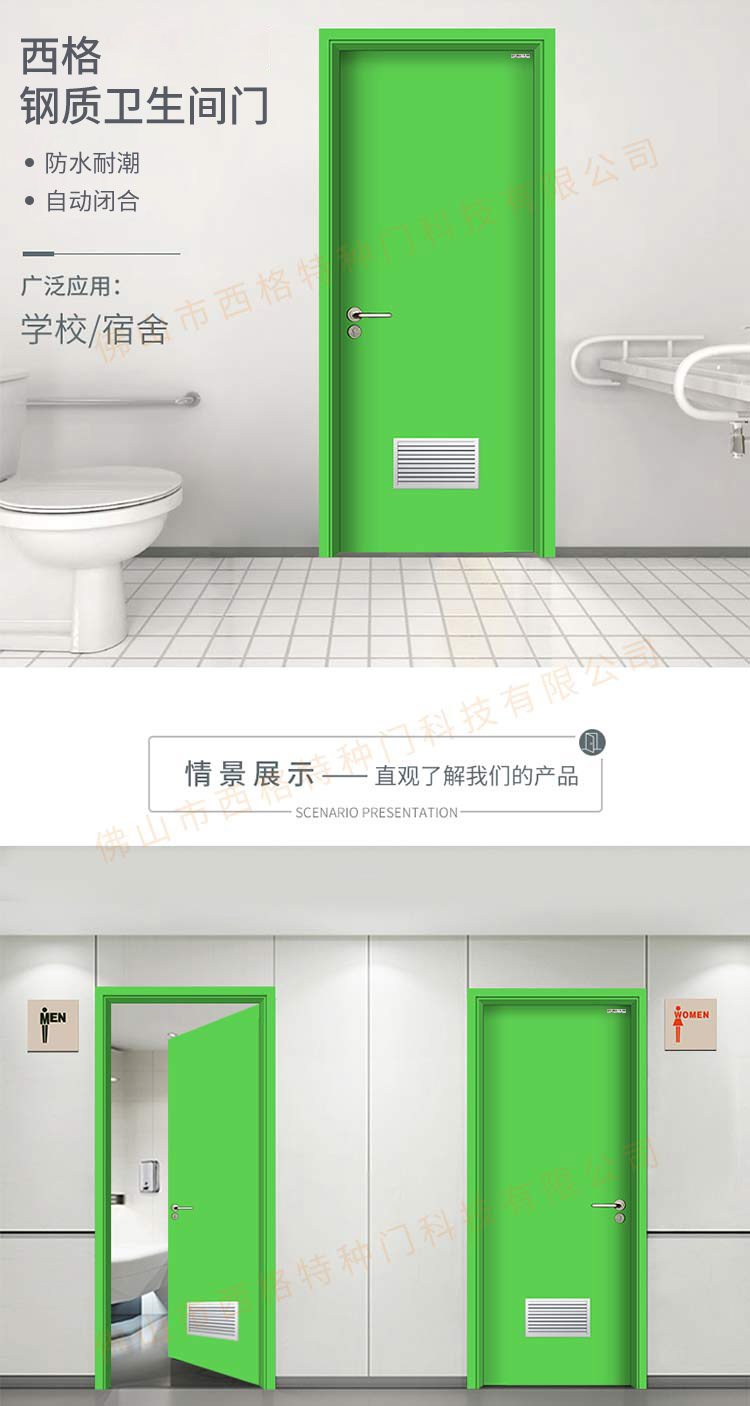 产品简介:chnsige西格特种门,专业生产学校门,学校卫生间门,学校洗手间门,钢质洗手间门,多钟款式、颜色,尺寸可定制。