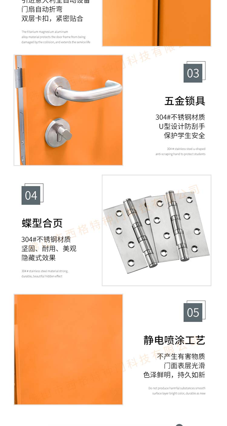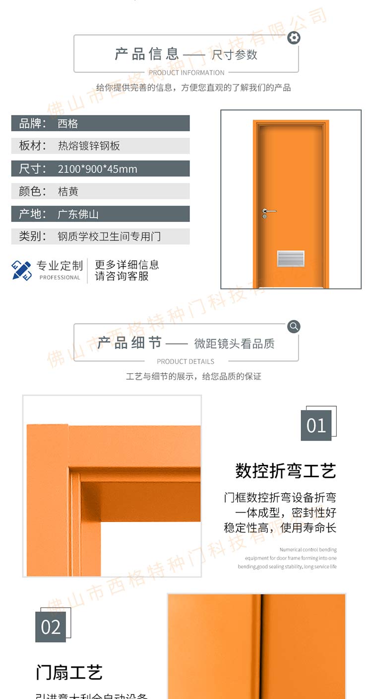 产品简介:chnsige西格特种门,专业生产学校门,学校卫生间门,学校洗手间门,钢质洗手间门,多钟款式、颜色,尺寸可定制。