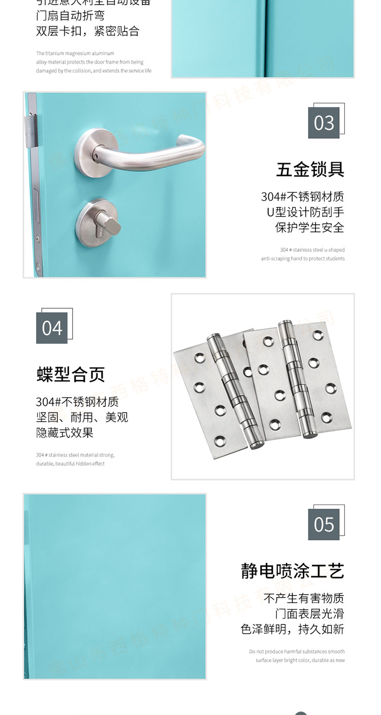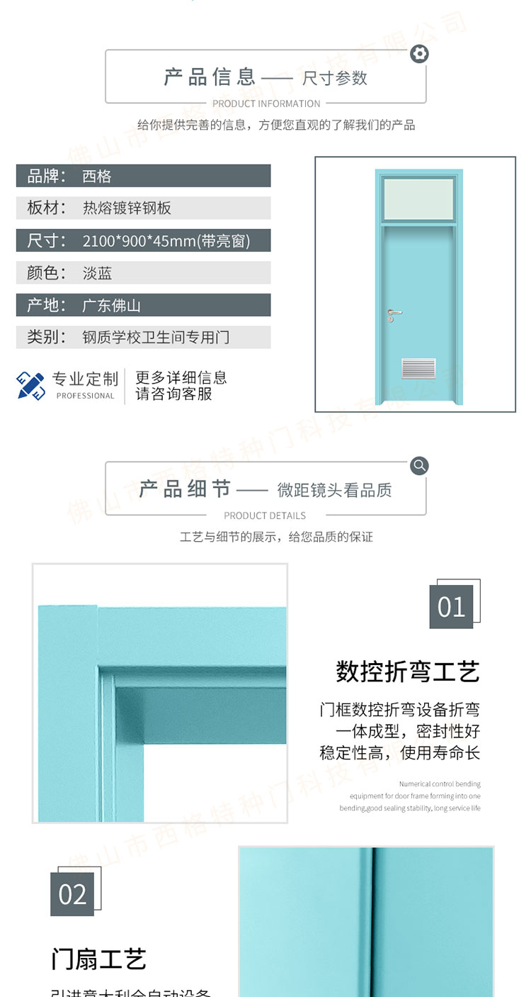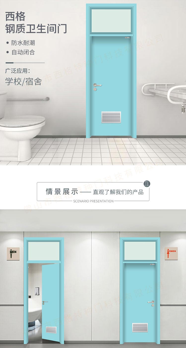 产品简介:chnsige西格特种门,专业生产学校门,学校卫生间门,学校洗手间门,钢质洗手间门,多钟款式、颜色,尺寸可定制。