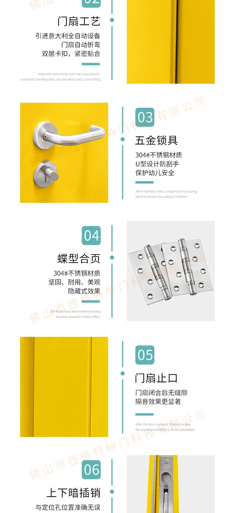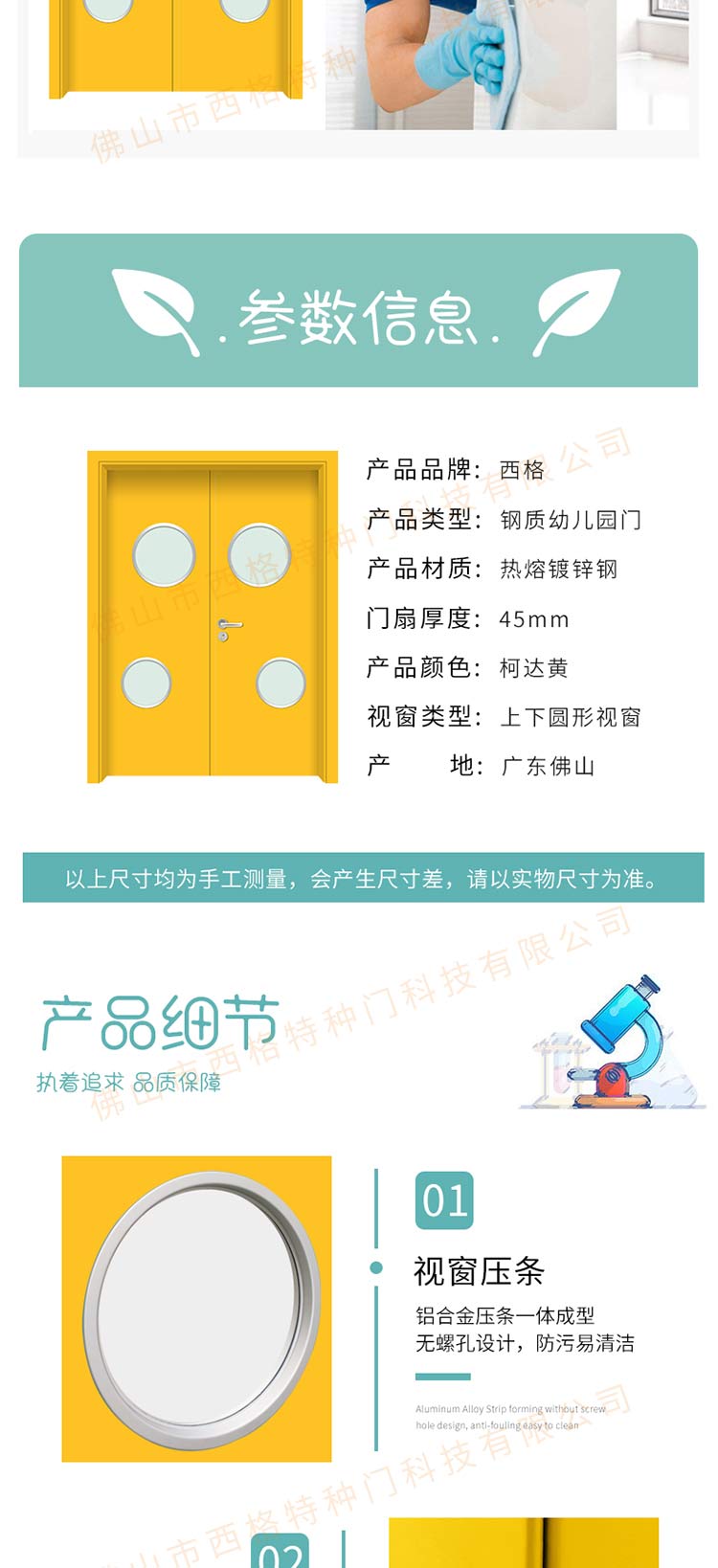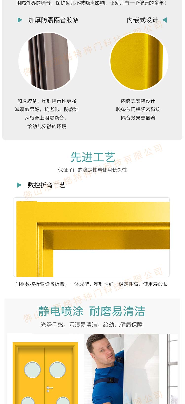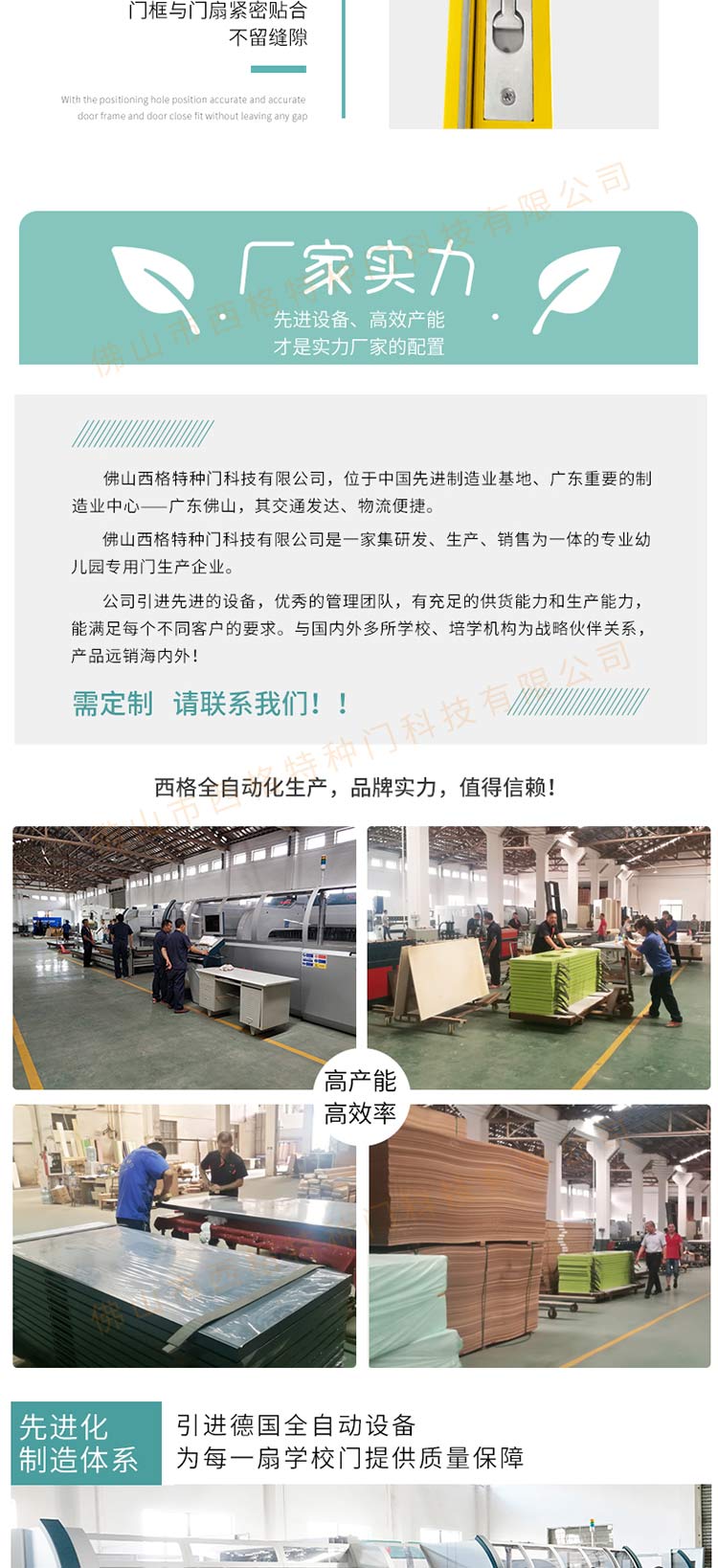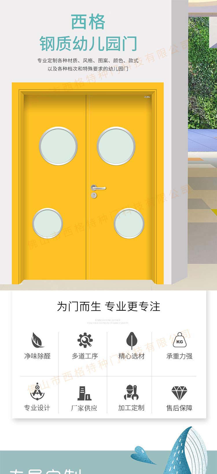 产品简介:chnsige西格特种门,专业生产幼儿园门,幼儿园钢质门,钢质幼儿园门,多钟款式、颜色,尺寸可定制。