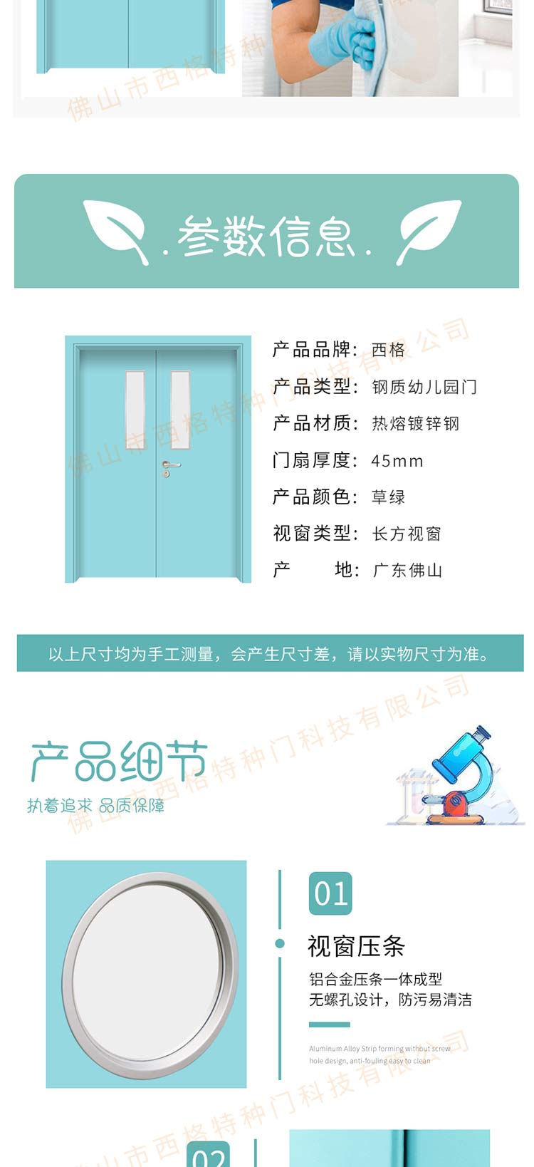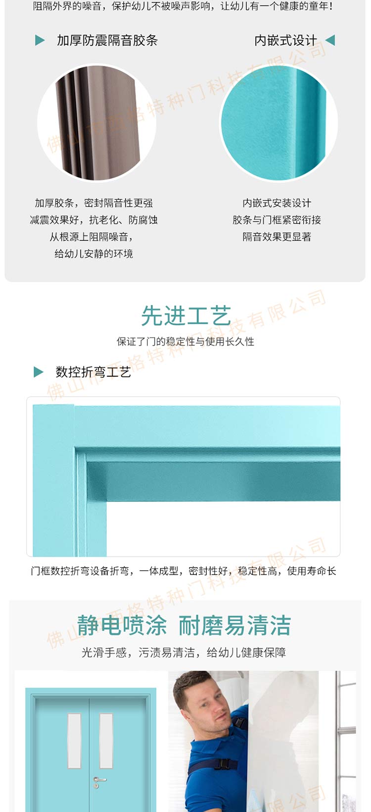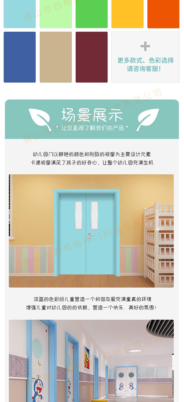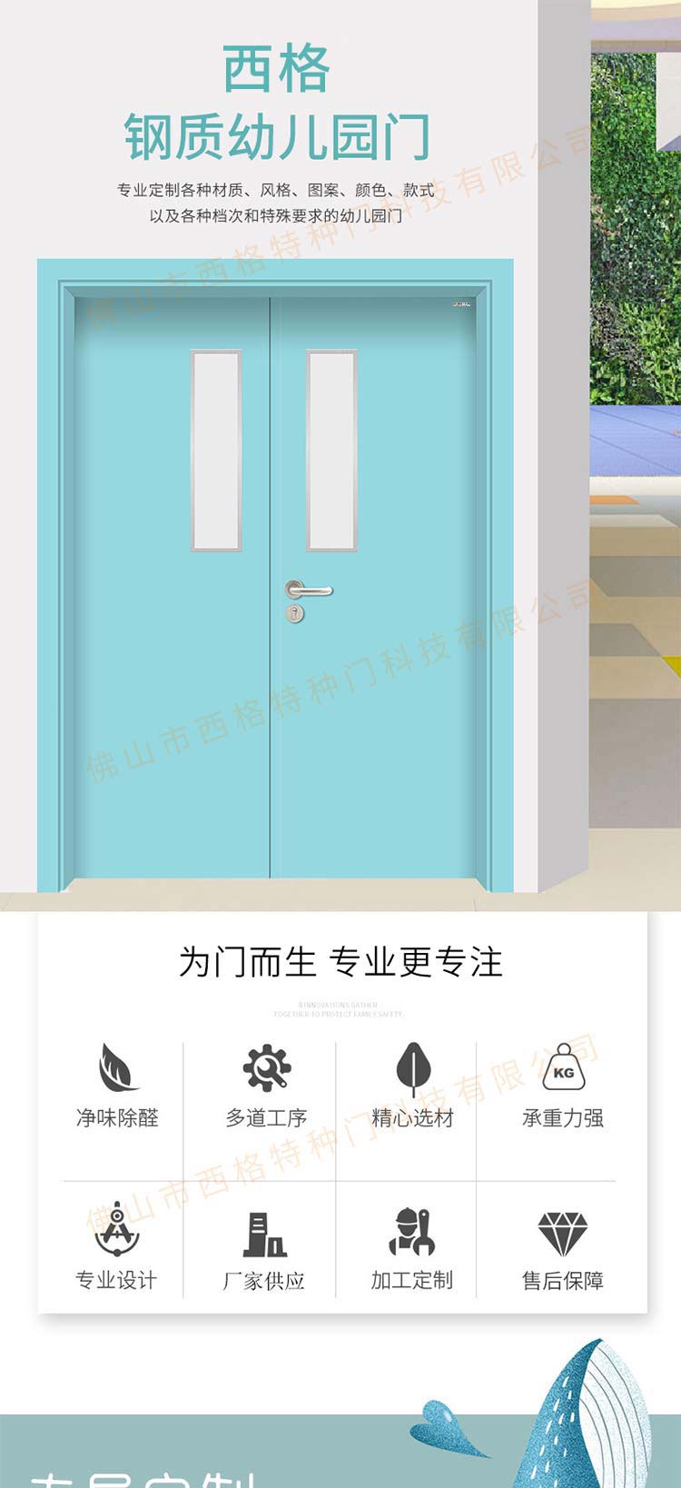 产品简介:chnsige西格特种门,专业生产幼儿园门,幼儿园钢质门,钢质幼儿园门,多钟款式、颜色,尺寸可定制。