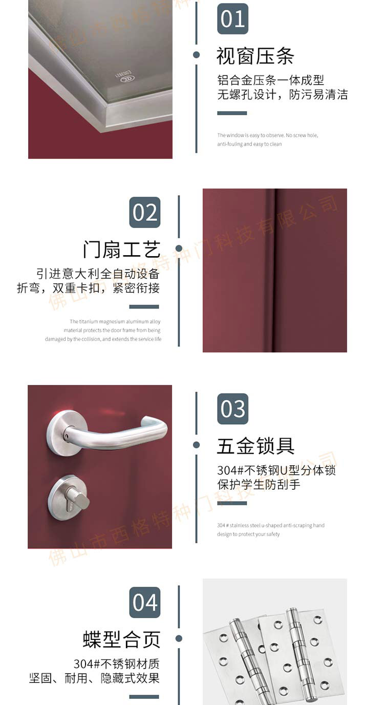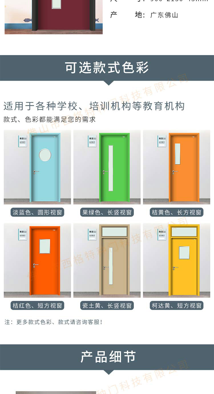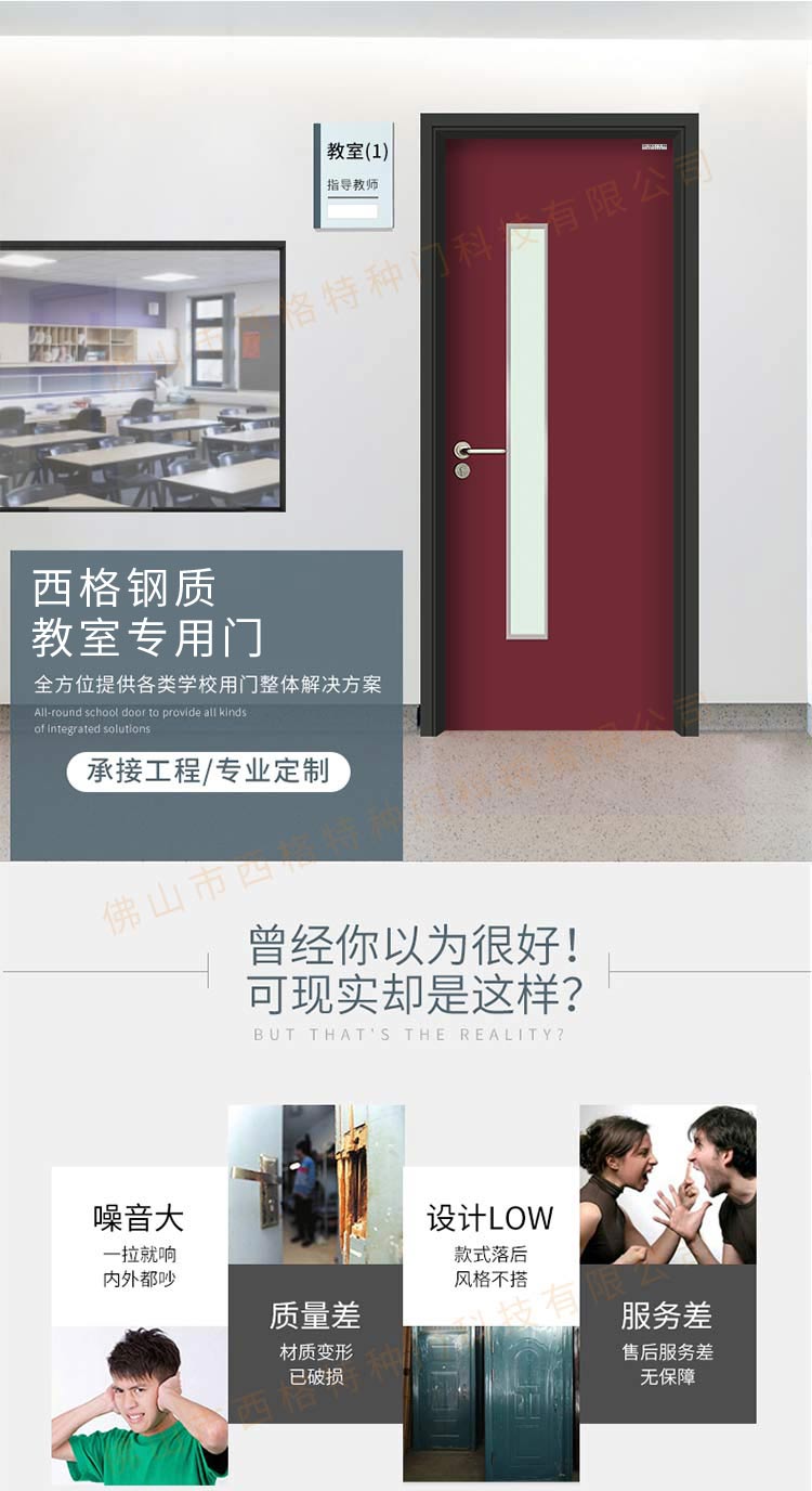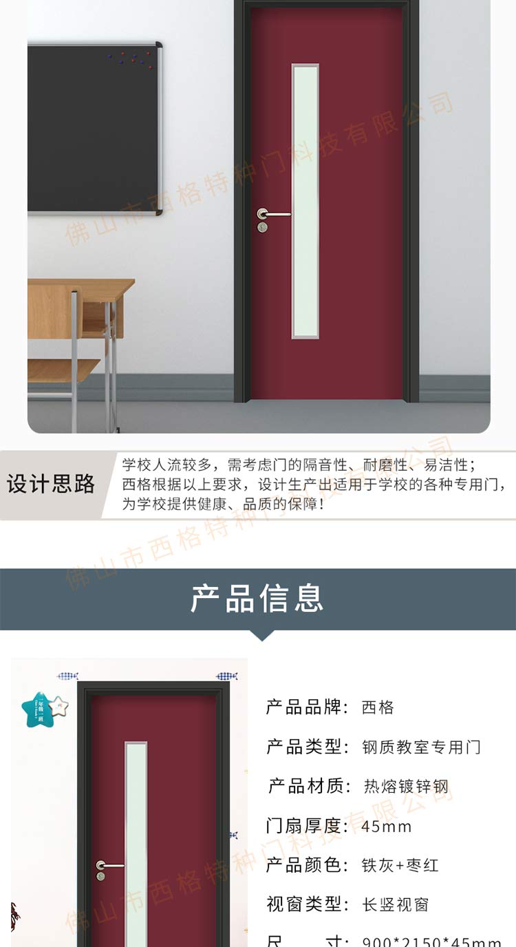 产品简介:chnsige西格特种门,专业生产教室门,学校教室门,教室门钢质门,培训班门,培训学校门,多钟款式、颜色,尺寸可定制。