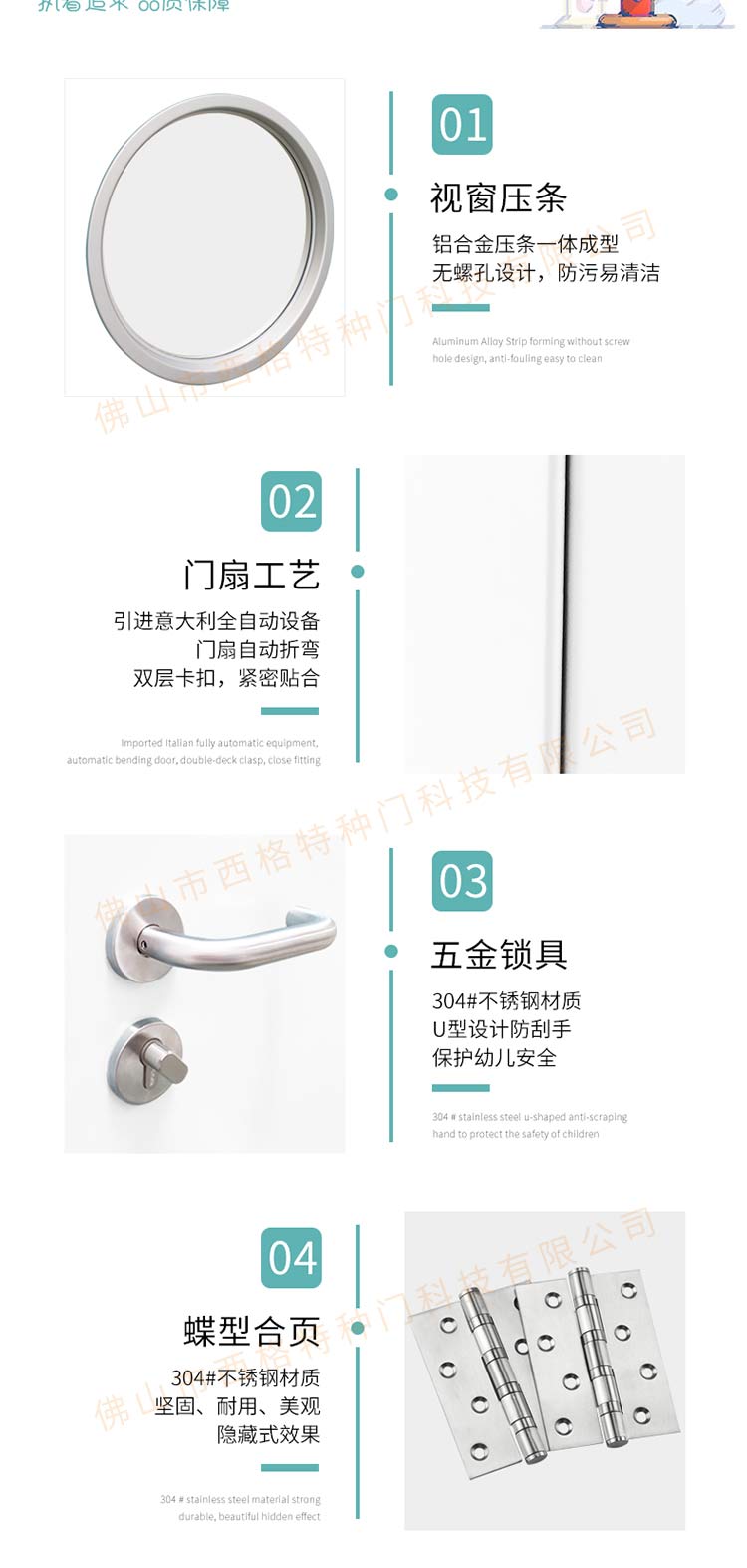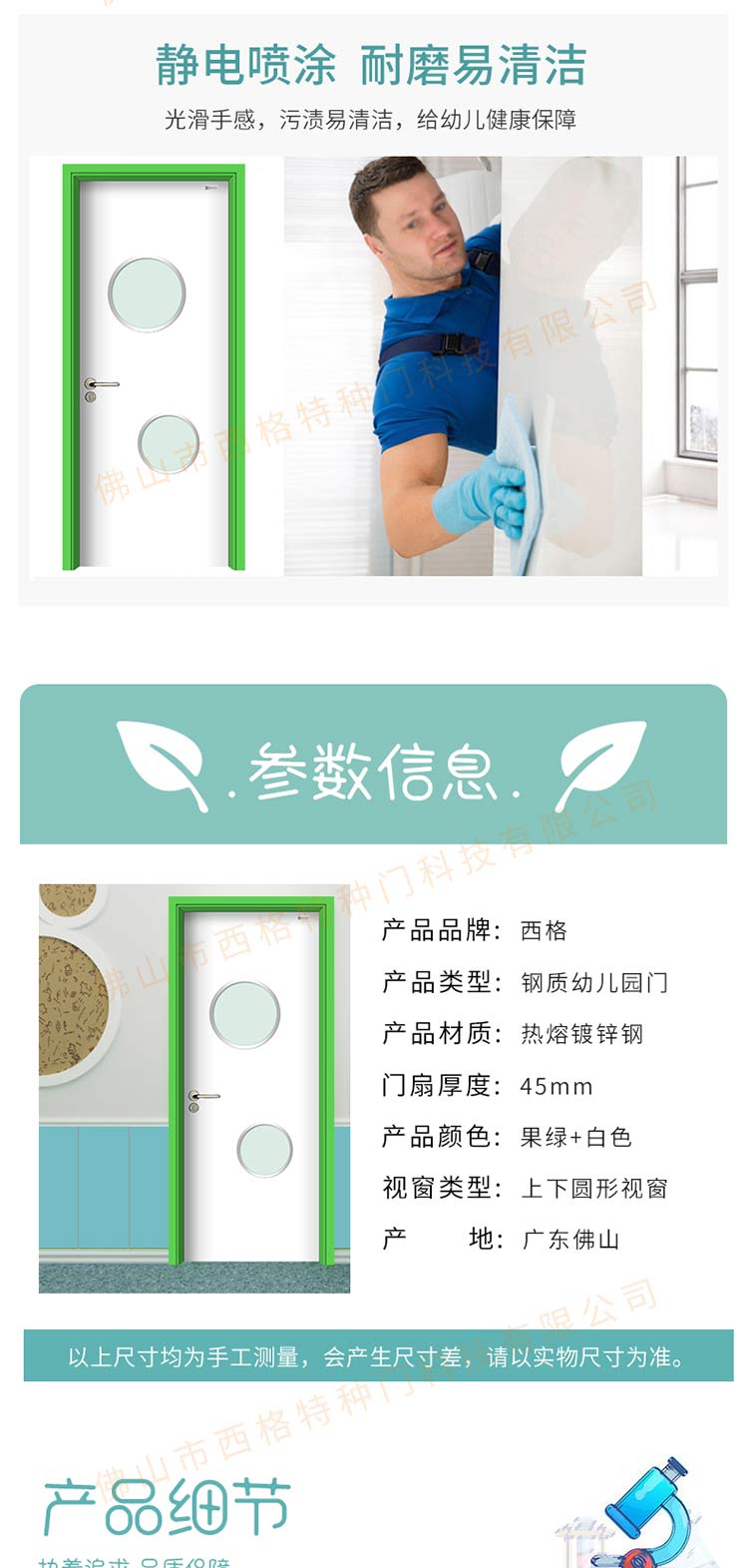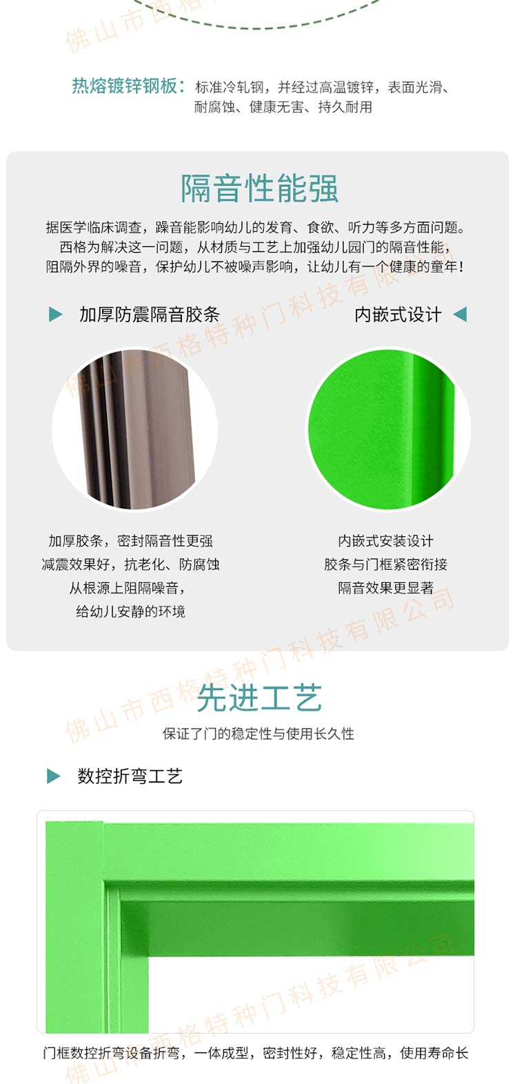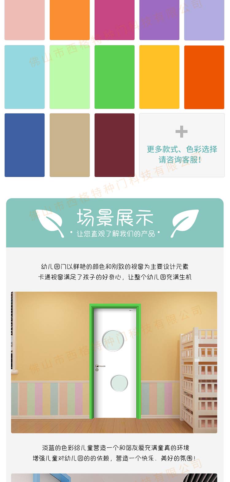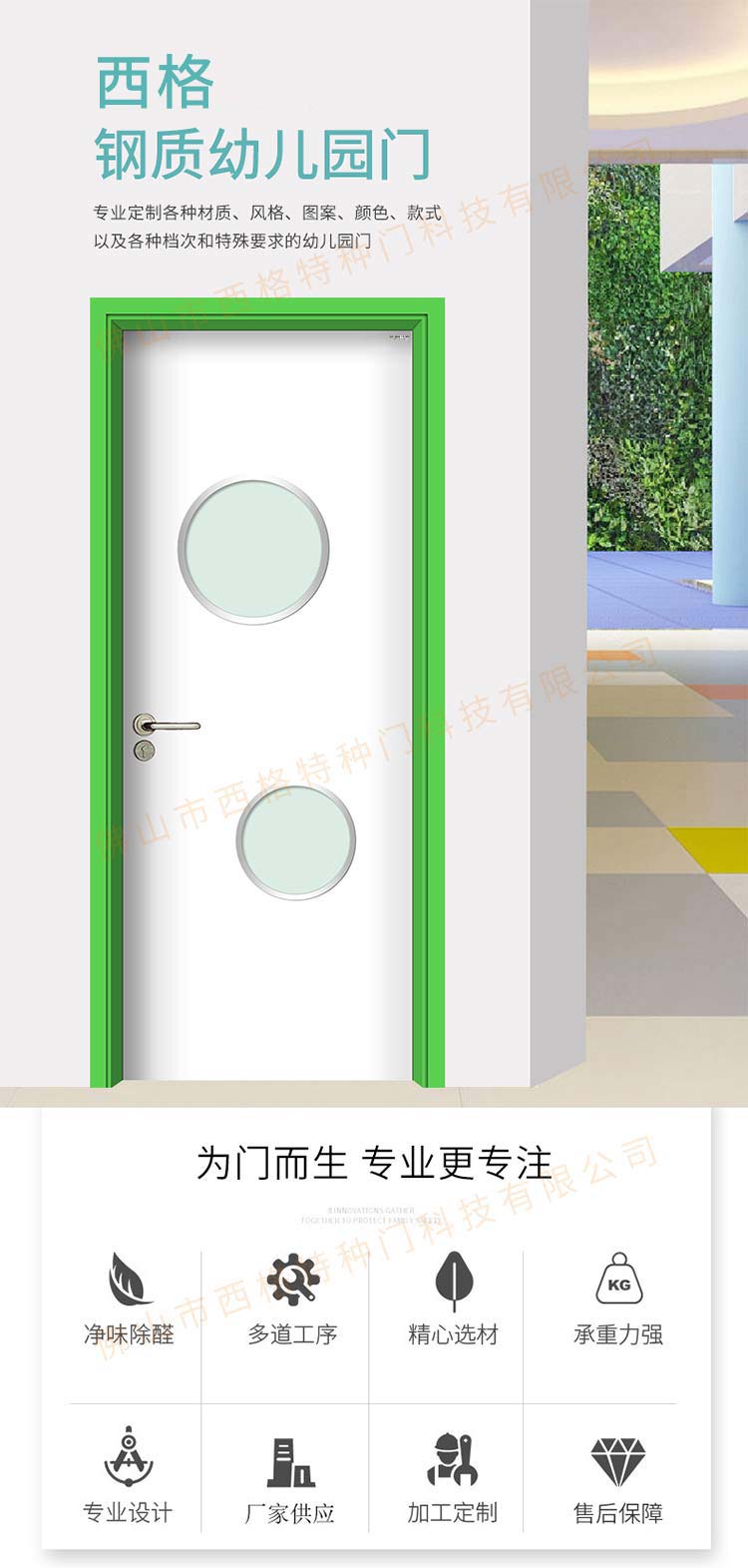 产品简介:chnsige西格特种门,专业生产幼儿园门,幼儿园钢质门,钢质幼儿园门,多钟款式、颜色,尺寸可定制。