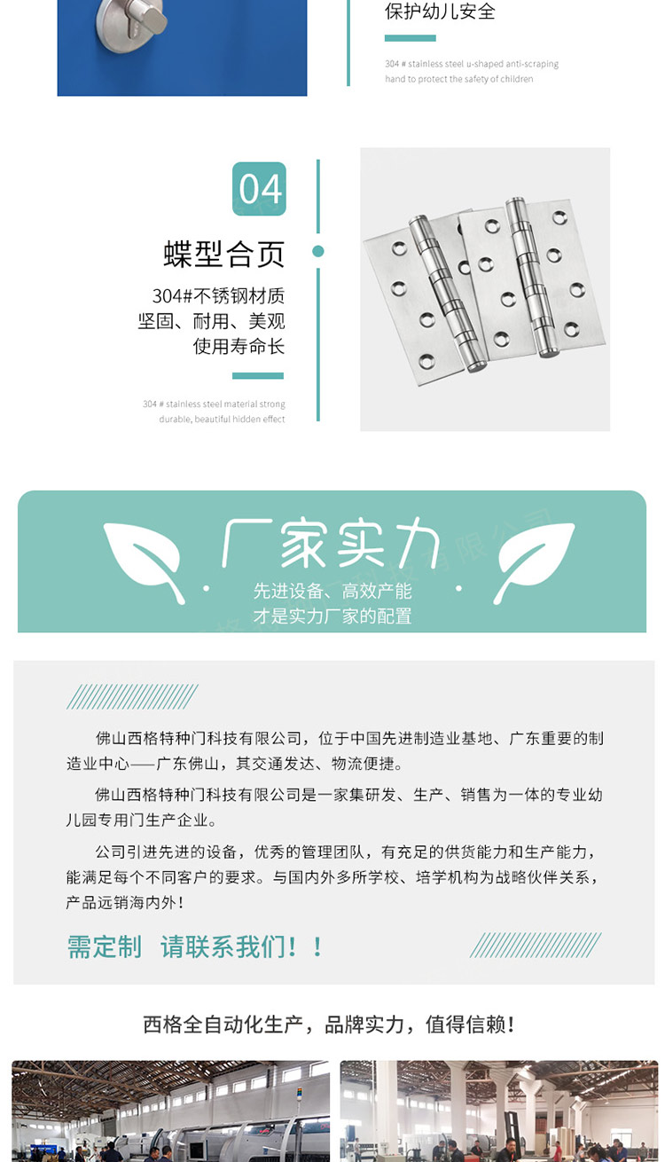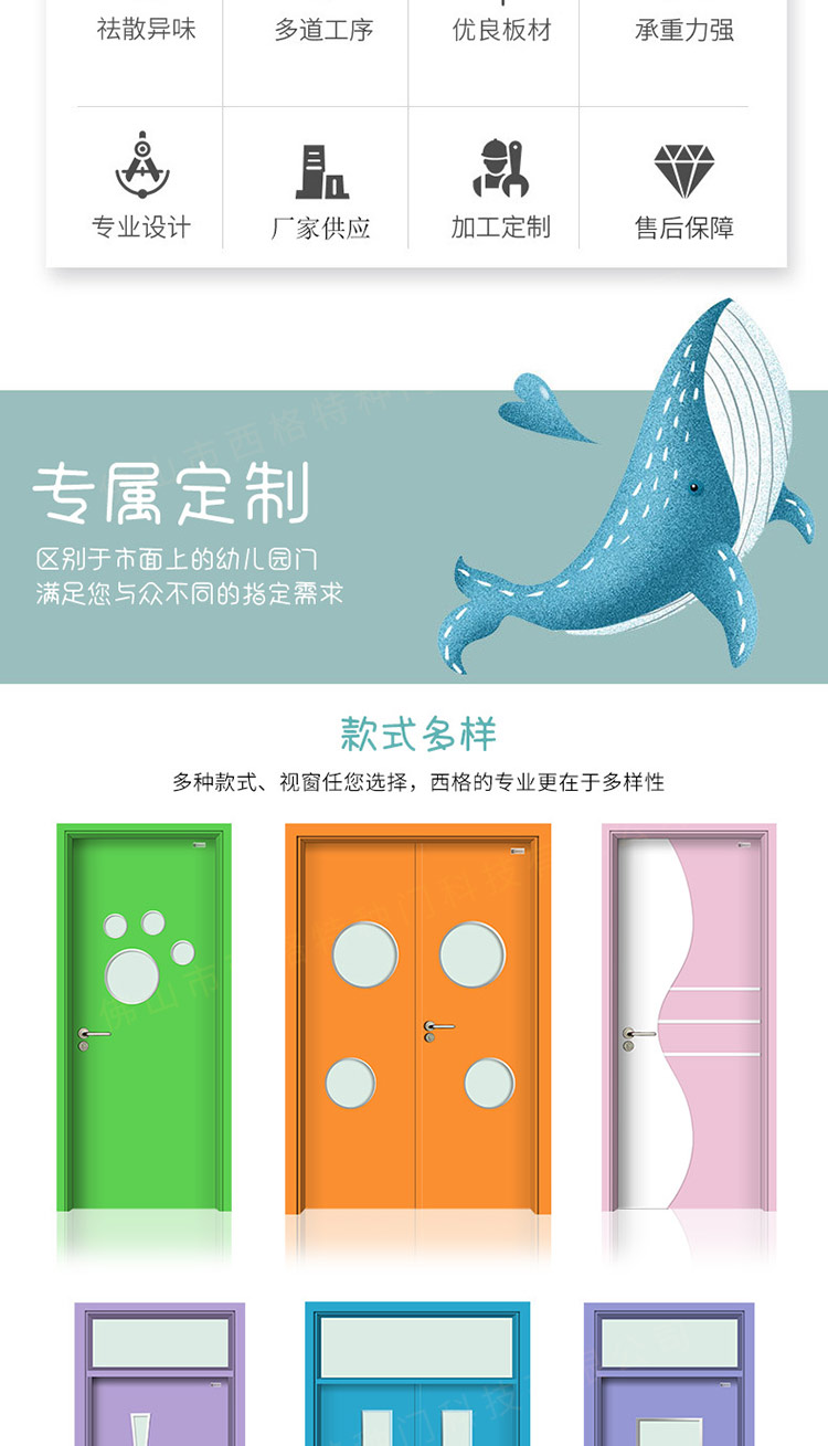 产品简介:chnsige西格特种门,专业生产幼儿园门,木质幼儿园门,幼儿园木门,幼儿园教室门,多钟款式、颜色,尺寸可定制。