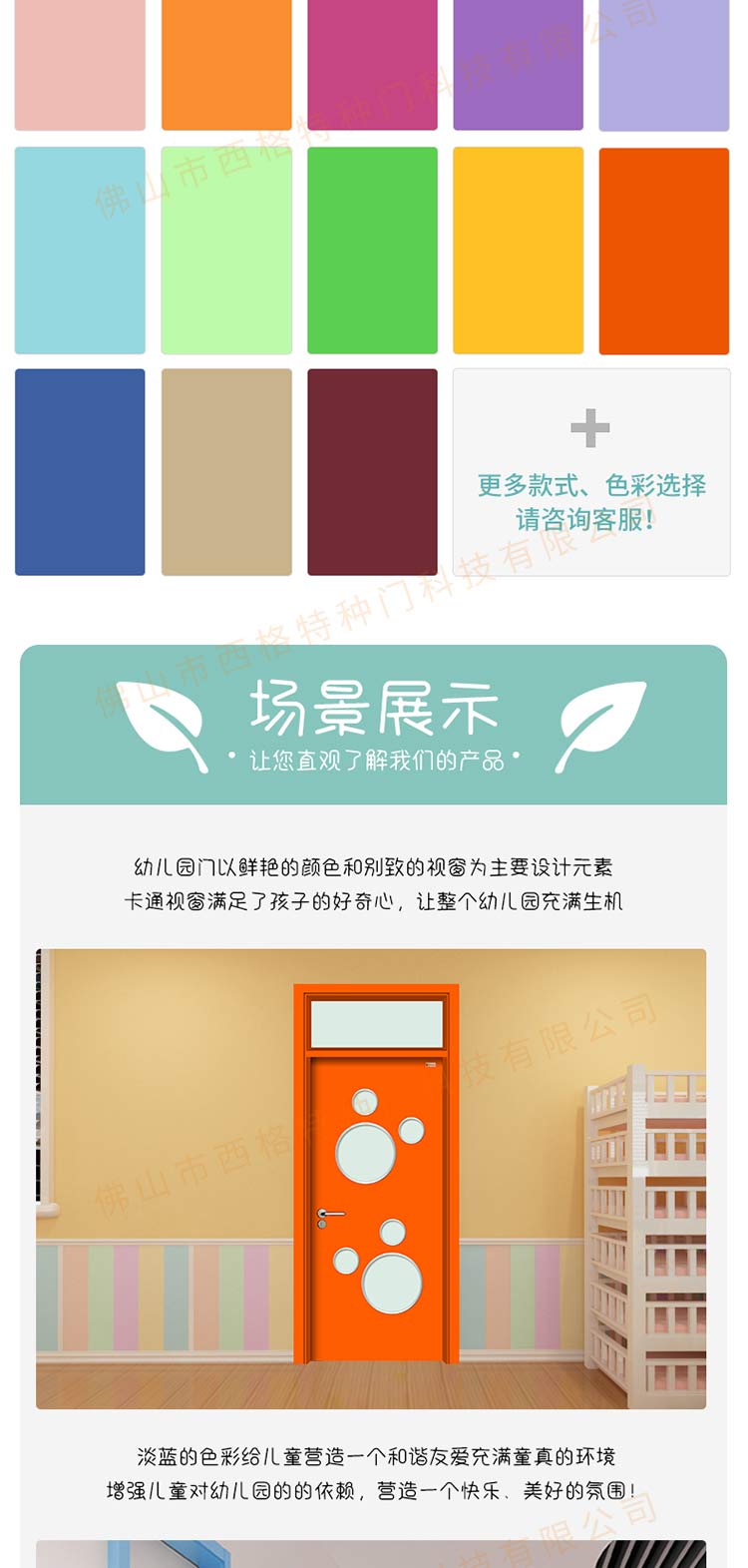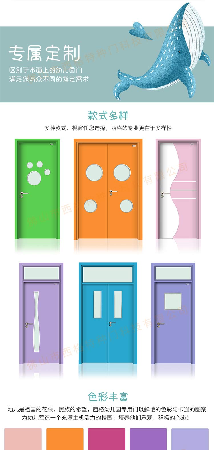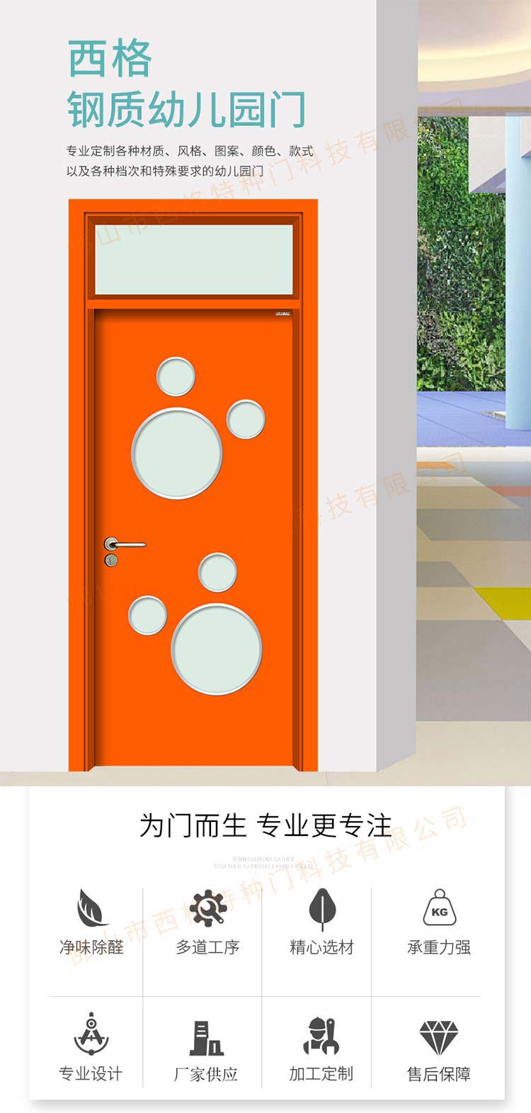 产品简介:chnsige西格特种门,专业生产幼儿园门,幼儿园钢质门,钢质幼儿园门,多钟款式、颜色,尺寸可定制。