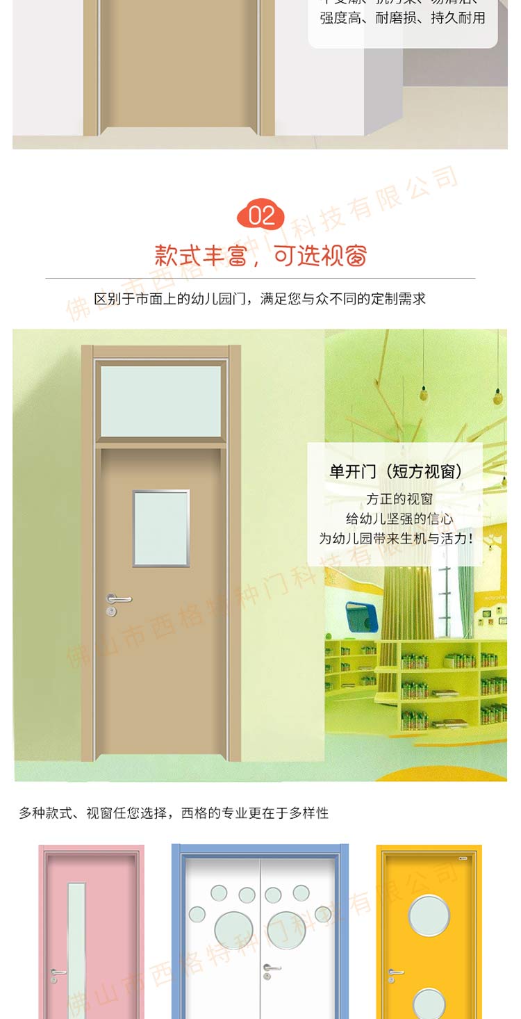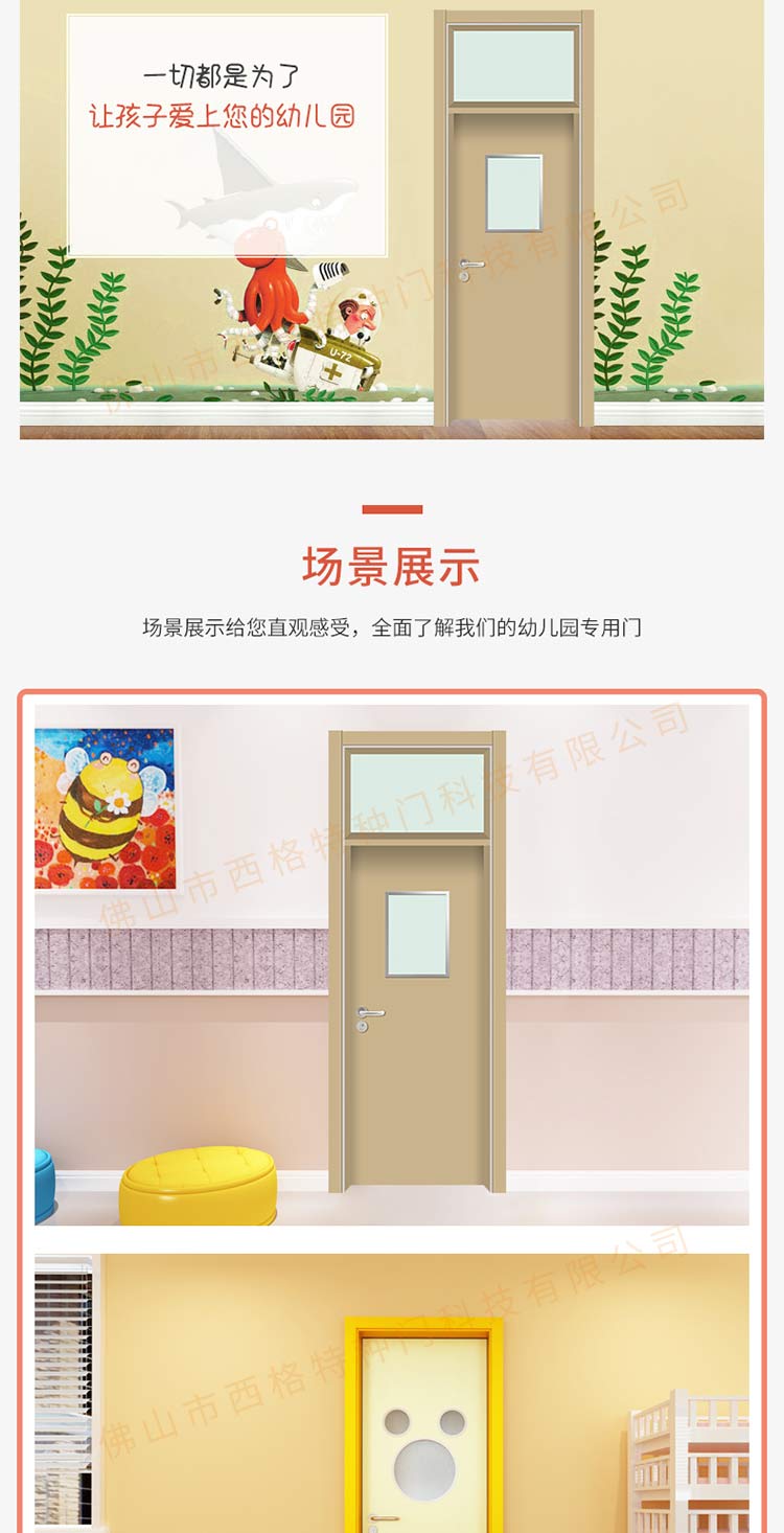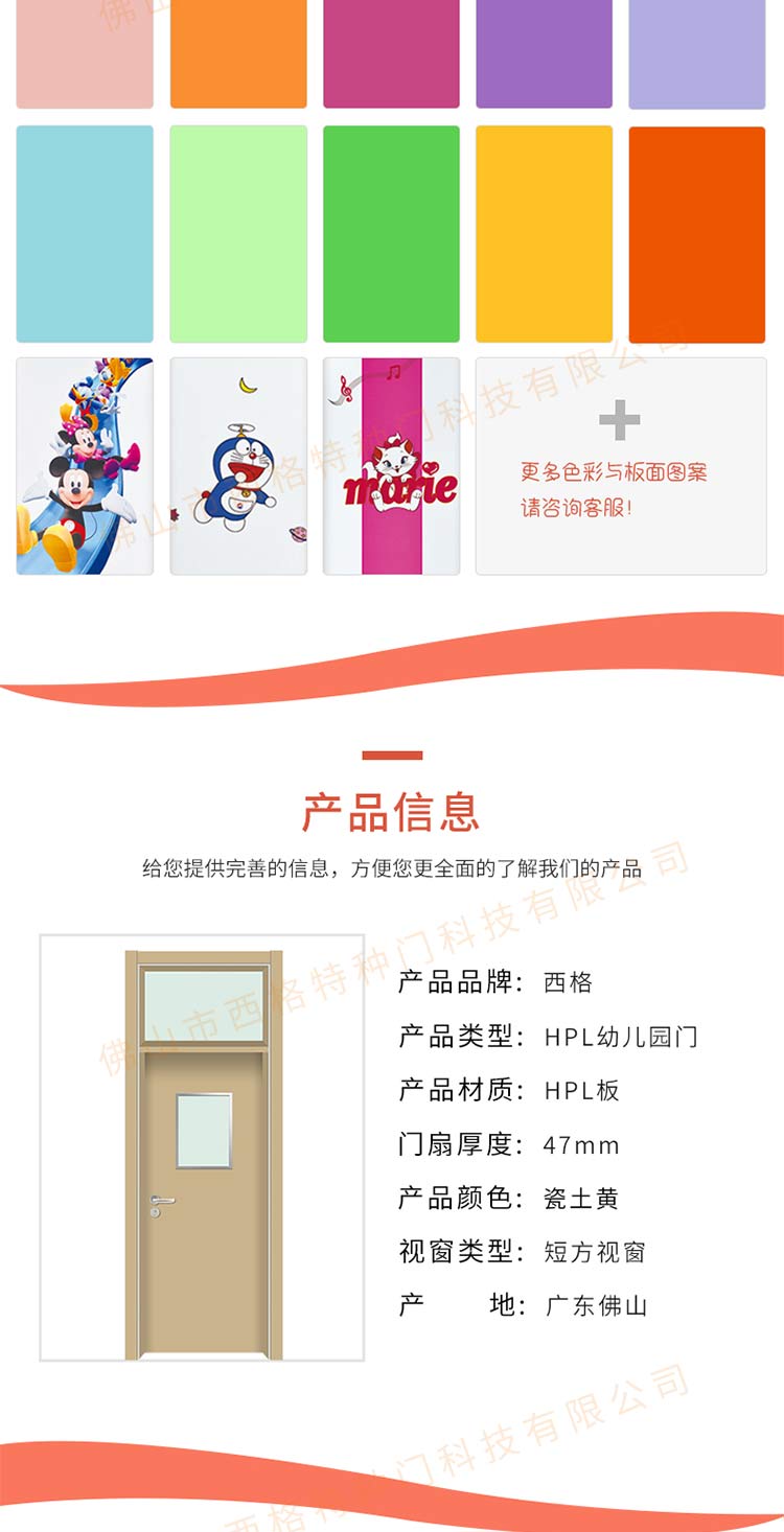 产品简介:chnsige西格特种门,专业生产幼儿园门,木质幼儿园门,幼儿园木门,幼儿园教室门,多钟款式、颜色,尺寸可定制。