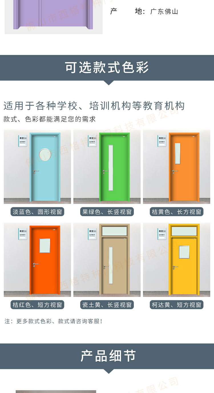 产品简介:chnsige西格特种门,专业生产教室门,学校教室门,教室门木门,培训班门,培训学校门,多钟款式、颜色,尺寸可定制。