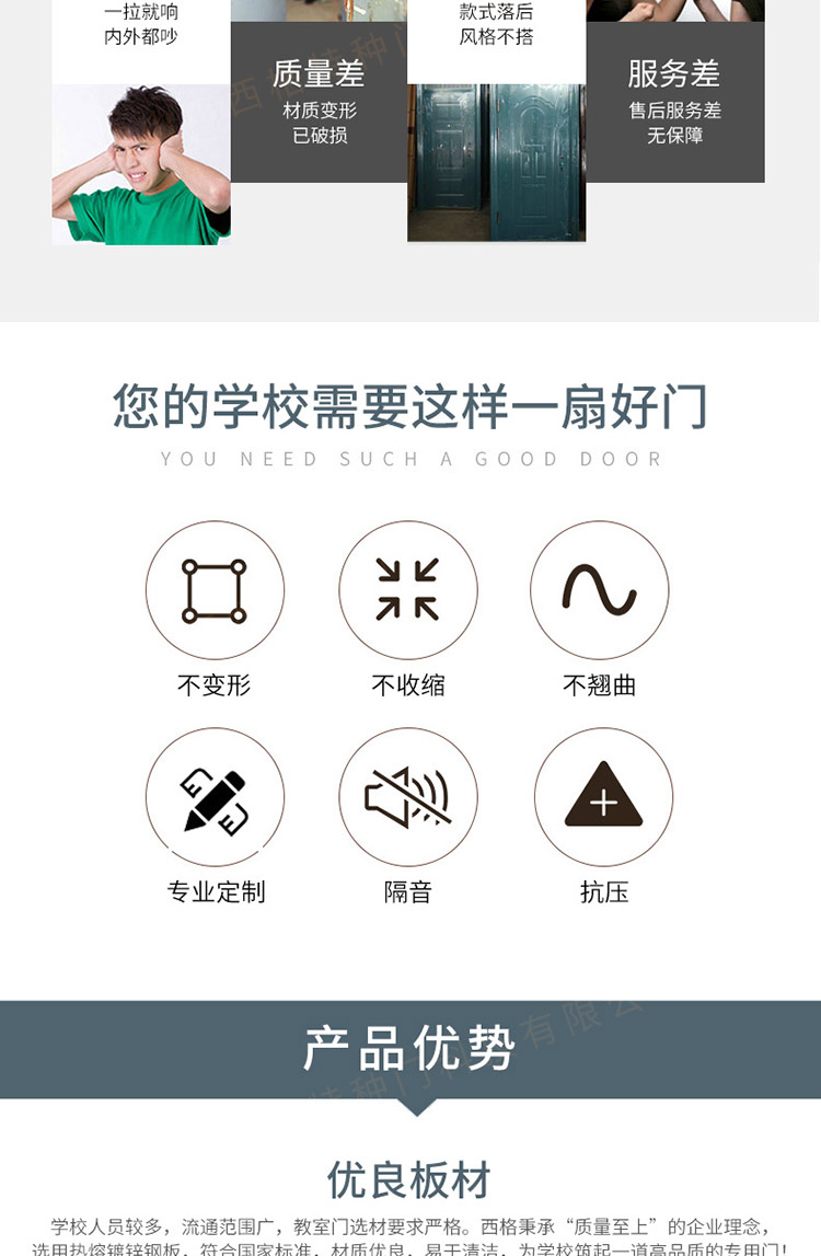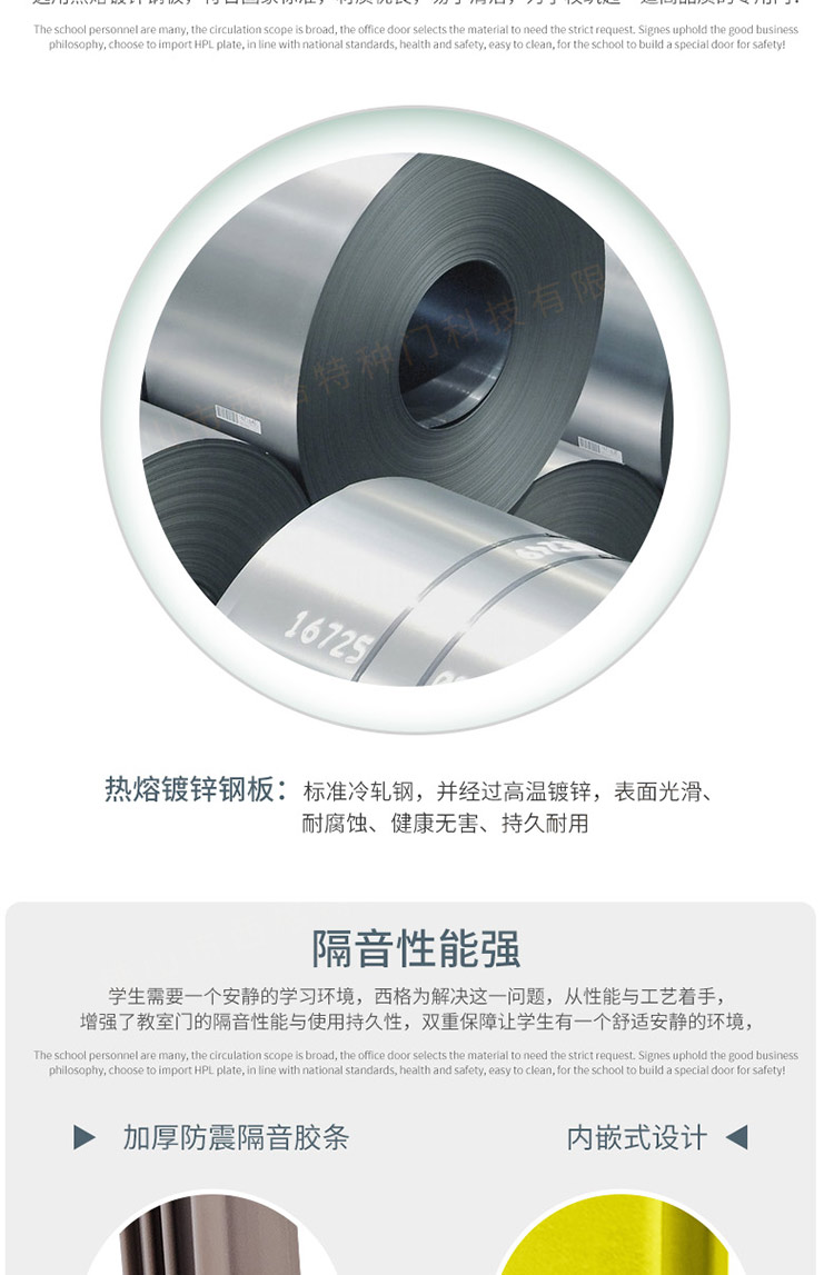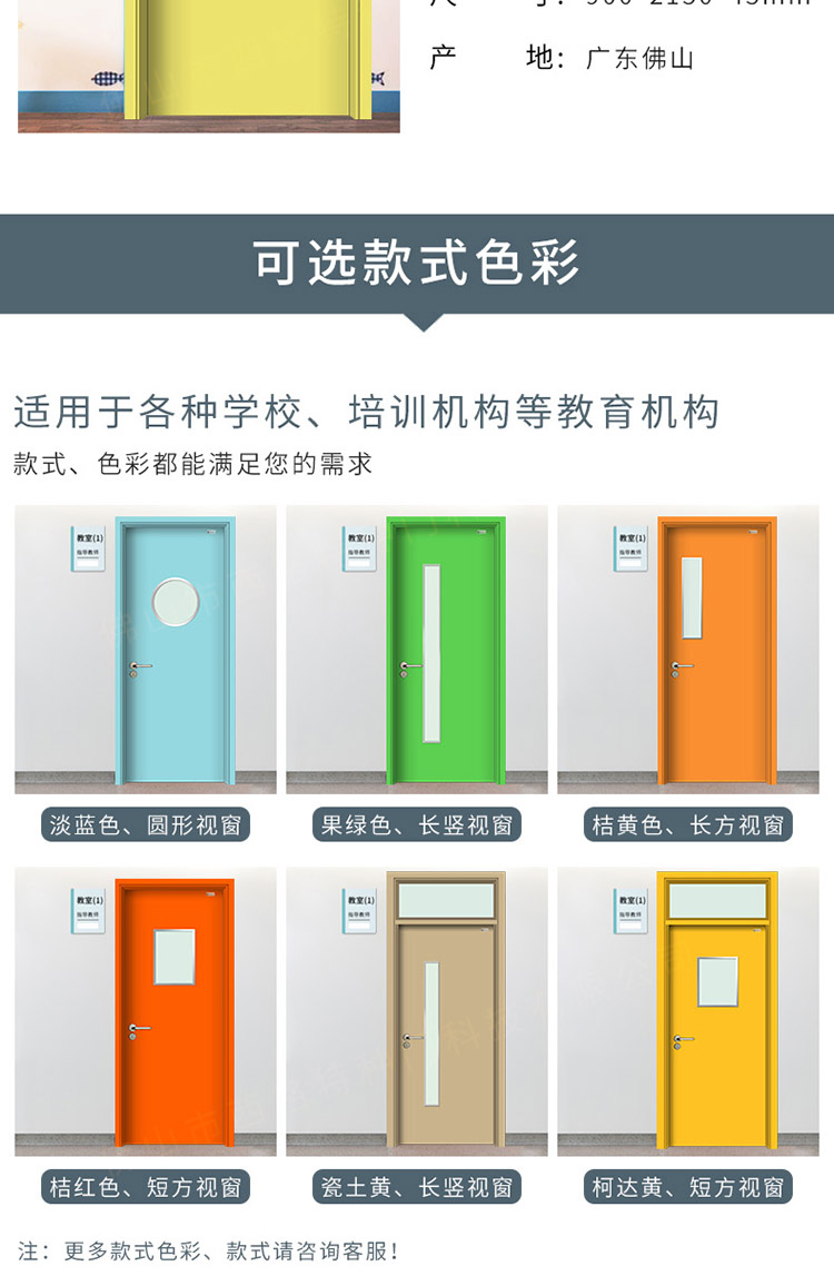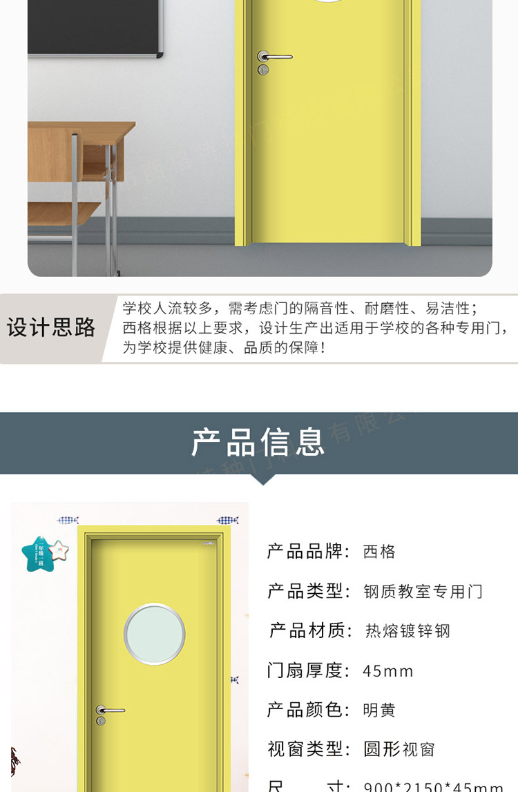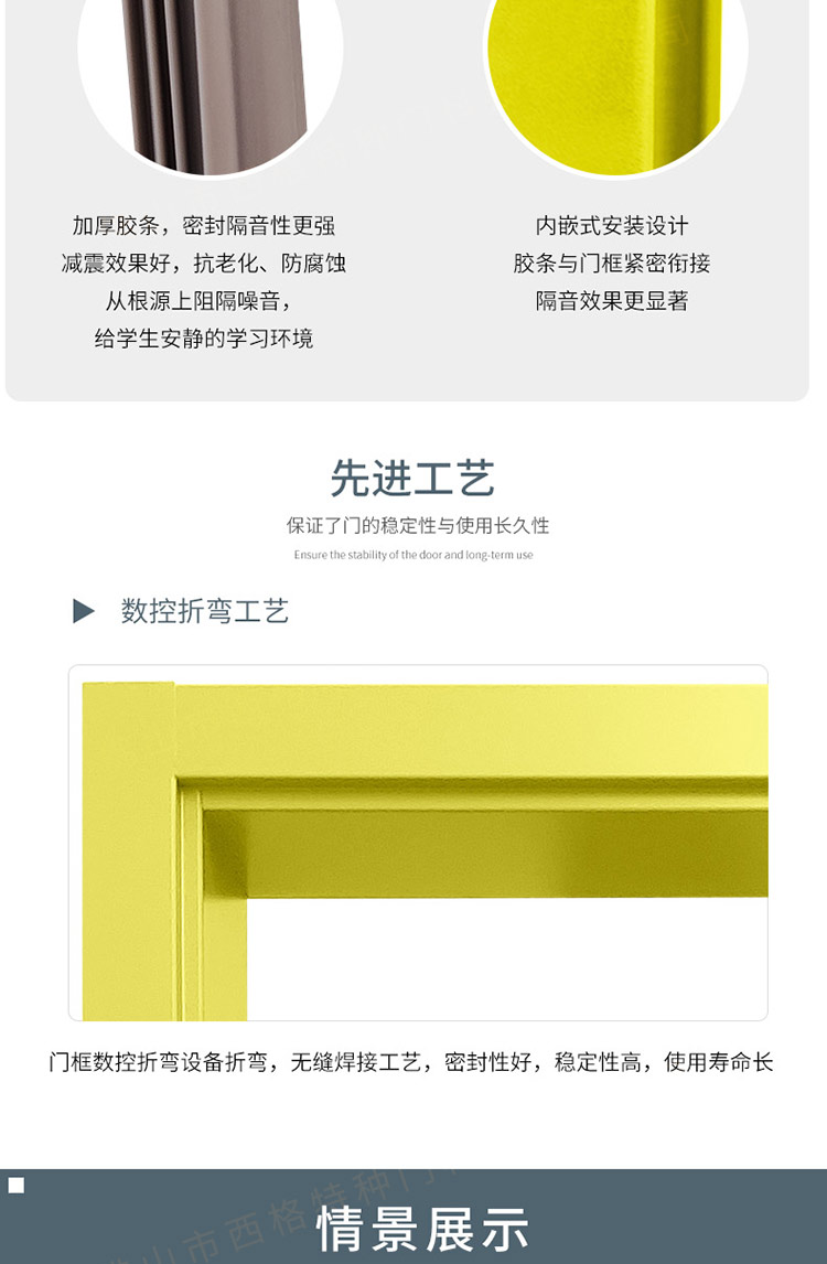 产品简介:chnsige西格特种门,专业生产学校门,学校教室门,学校办公室门,学校卫生间门,学校钢质门,钢质学校门,多钟款式、颜色,尺寸可定制,专业...