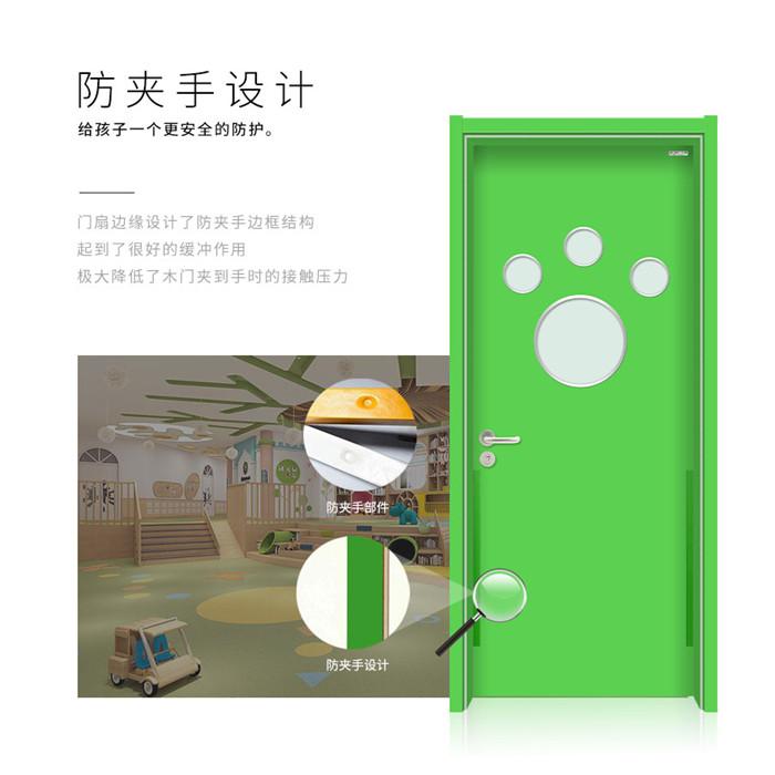 在细节上,西格学校门采用硅胶材料,自主研发设计了防夹手胶条,门扇边缘设计了特别的防夹手边框结构,起到了很好的缓冲作用,降低了木门夹到手时的接触压力。