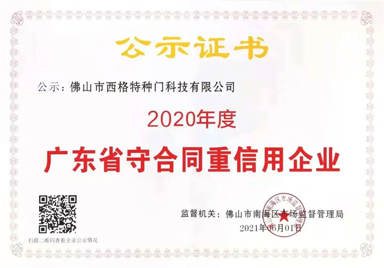 西格凭借良好的社会信誉、健全的合同管理体系及完善的服务流程体系,顺利通过佛山市市场监督管理局评审,荣获2020年度“广东省守合同重信用企业”称号!